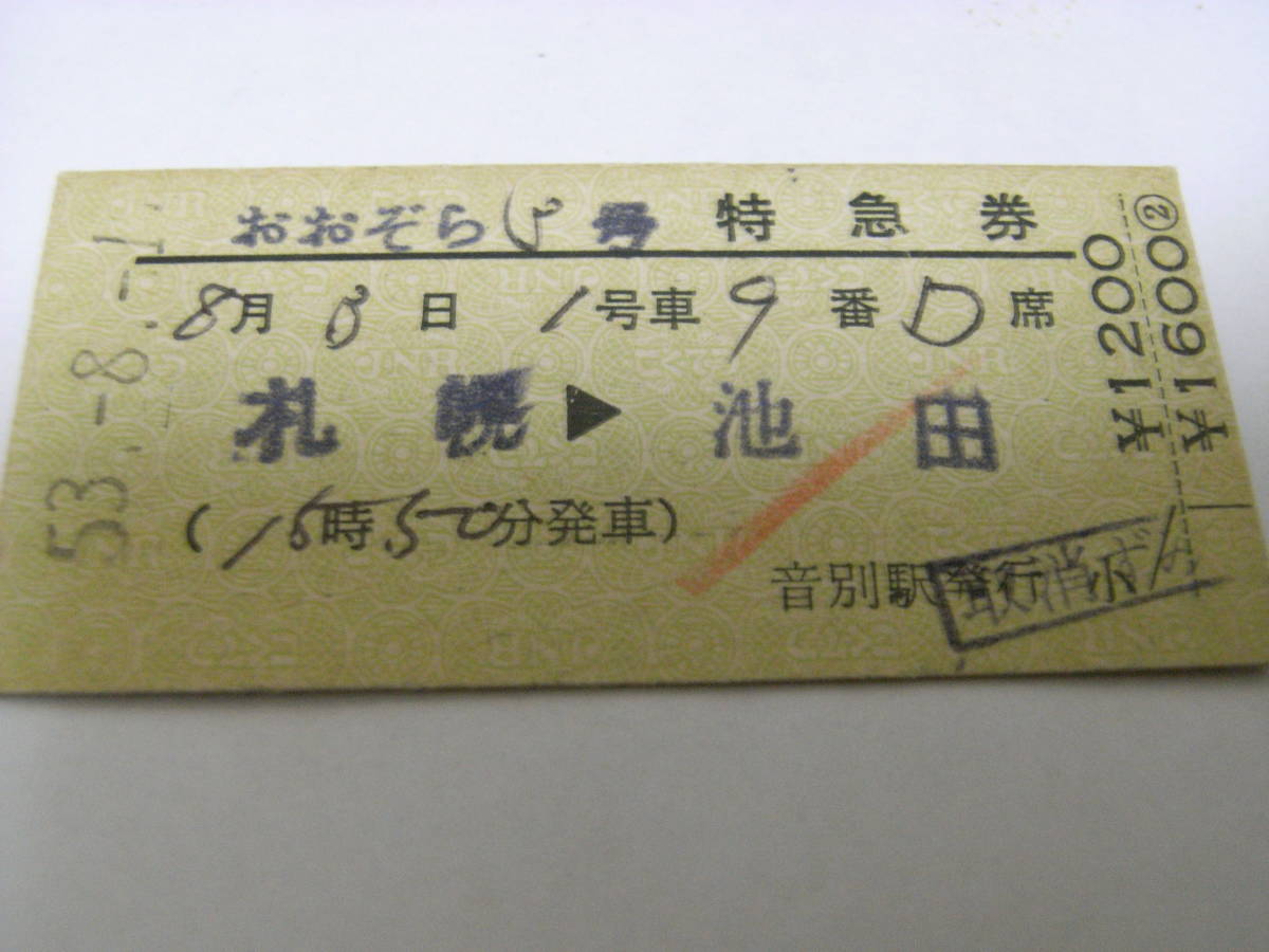 おおぞら3号 特急券 札幌→池田 昭和53年8月1日発行 音別駅発行
