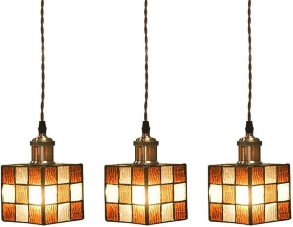 OTD【琥珀色&クリア 引掛けシーリング式】3個セット ペンダントライト キューブ型 E26口金 LED対応 ガラス照明 吊り下げライト