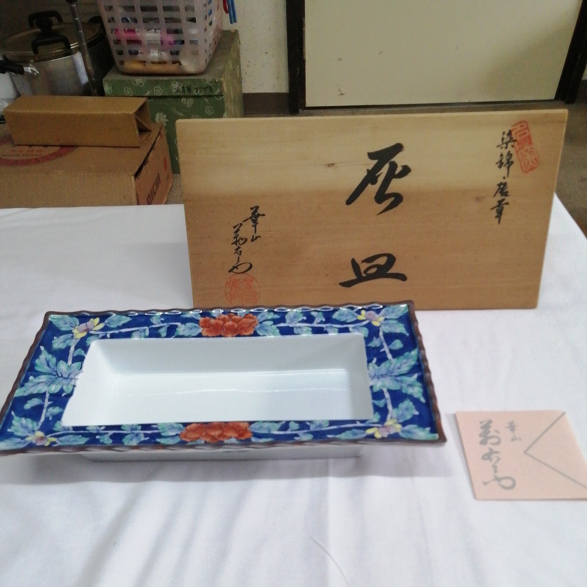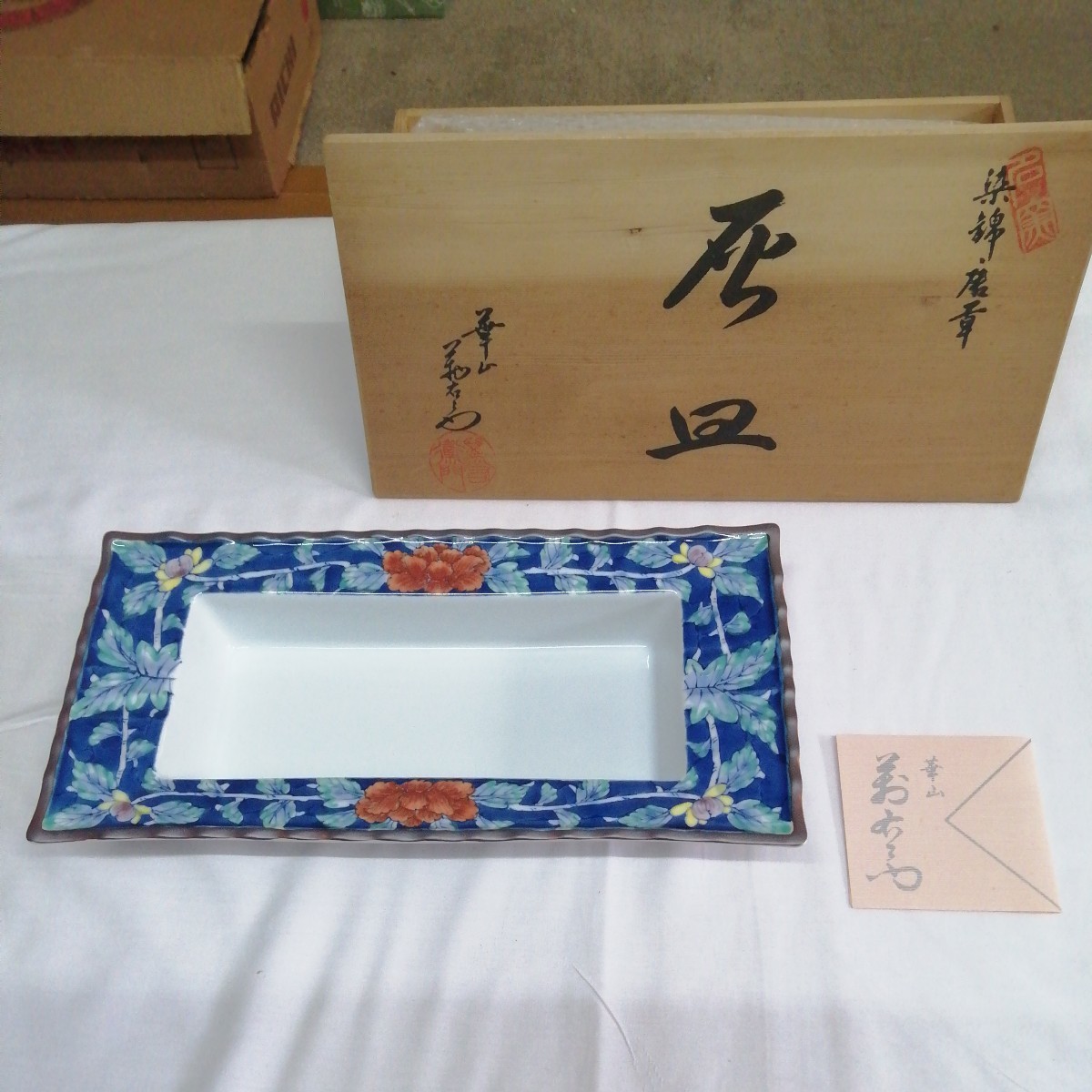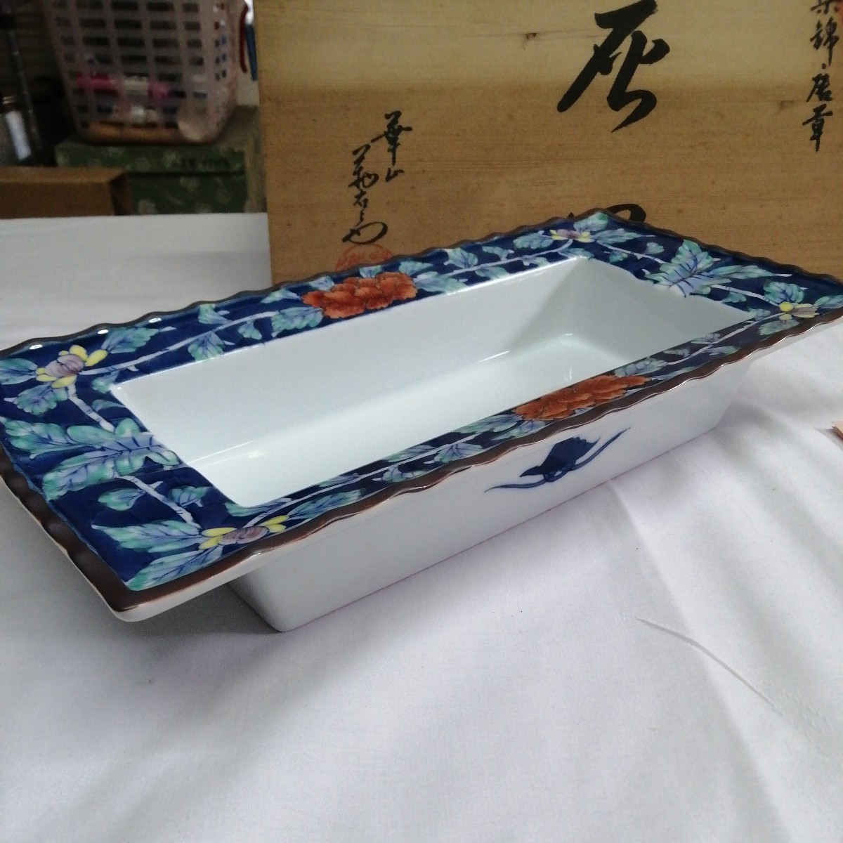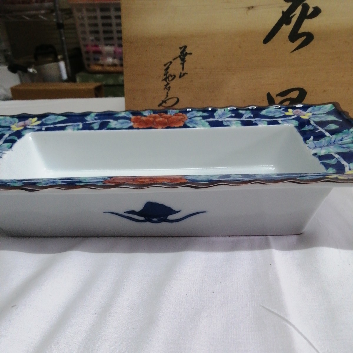 有田焼 華山 萬右衛門 染錦 唐 華 木箱入 灰皿 陶磁器 社長室 応接室 (約高33×16.1cm) 大型灰皿