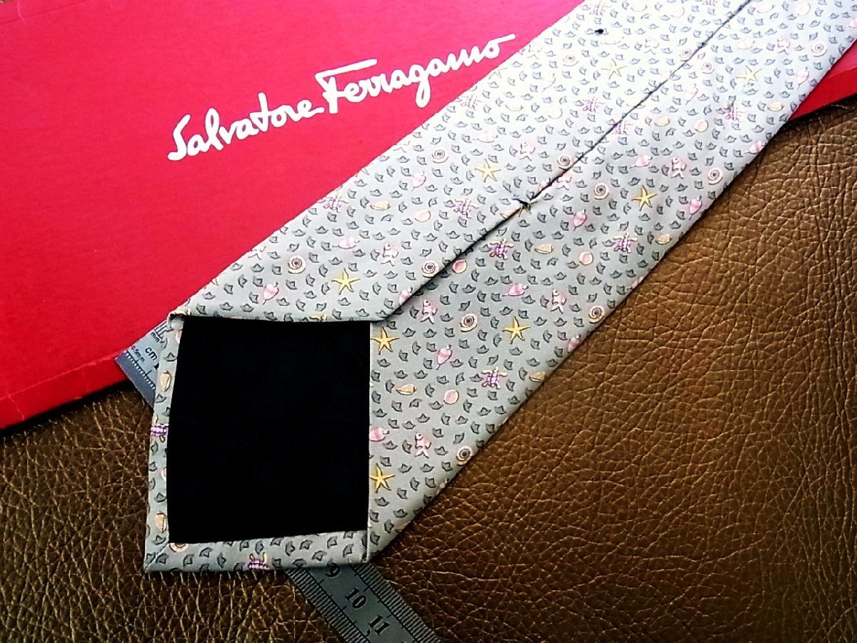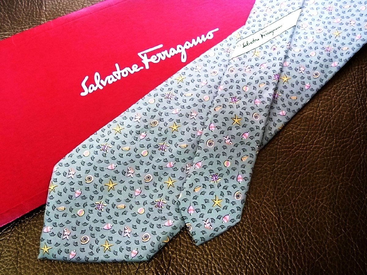 ★並品★4R00019【FERRAGAMO】フェラガモ「亀 魚 フィッシュ 貝 貝殻 ヒトデ 柄」ネクタイ
