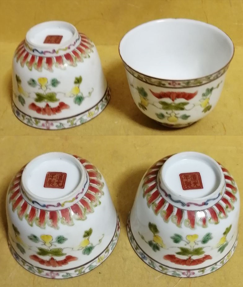 清代 染付 青花 粉彩 道光年製 酒杯 福禄 花図 唐物