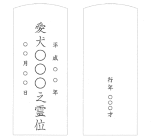 ●当店ではでは亡くなられたペットちゃんの霊をお祀りするために、表面にお名前、没日、裏面に行年(亡年齢)を豪華な仕上のお位牌(ひとに使われるものと同様)に記します。