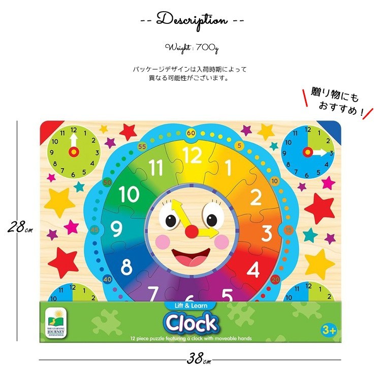 | 仕様 | 遊びながら楽しく時計と数字の学習が出来ます。 パズルで遊びながら、自然に興味が出てきます。 はじめは、絵と数字合わせで遊びつつ、 時計の針が動かせるので、ママやパパにお題をだしてもらって 時計(時刻)遊びも出来るよ! |