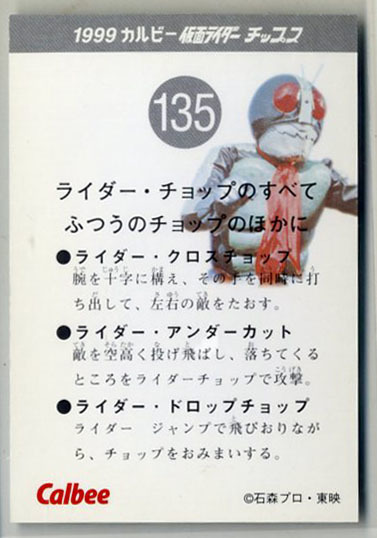 | ◆防水対策 厚紙補強 カルビー 仮面ライダーチップスカード(1999 復刻版) 135番 ライダーチョップのすべて ふつうのチョップのほかに トレカ 即決 | |
