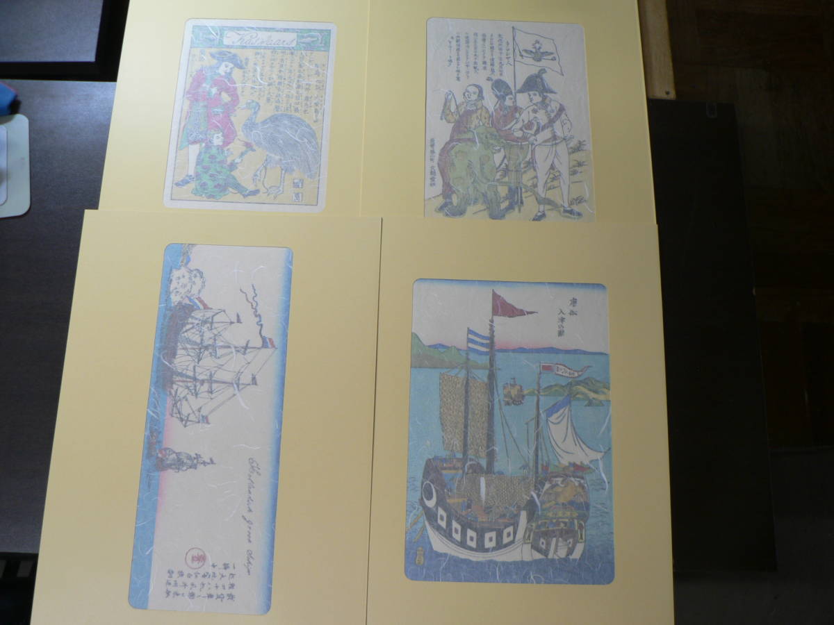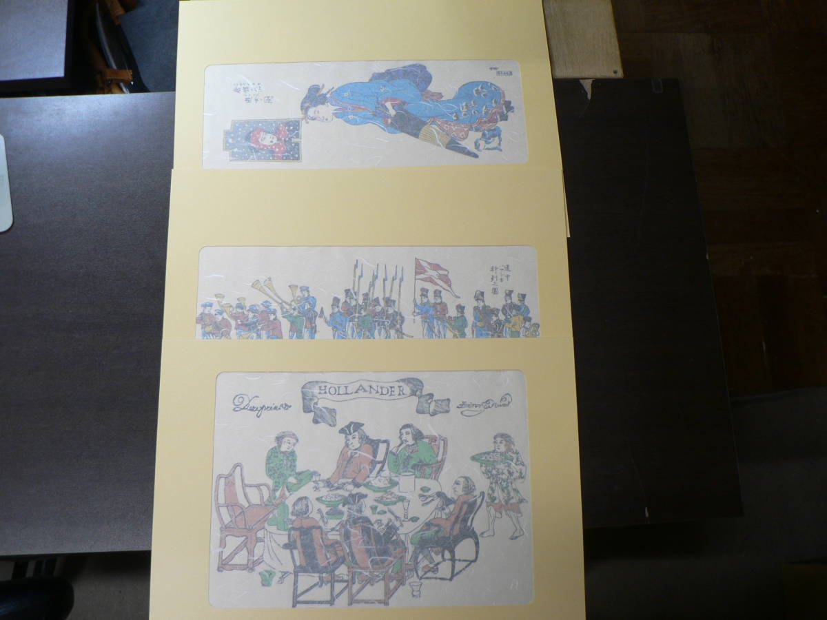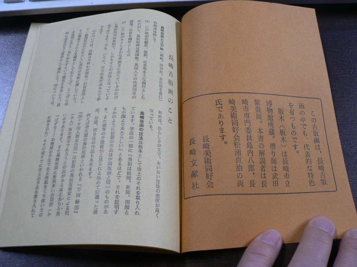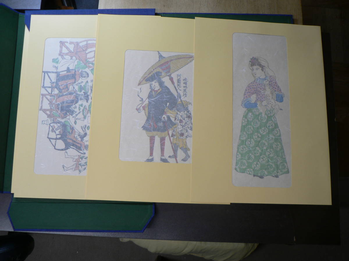 長崎古版画 10葉 長崎美術同好会 長崎文献社 阿蘭陀美人と狆、阿蘭陀船図、蘭人饗宴之図、道中ハヤシ方行列之図、唐館交加遊女の図、駝鳥之図、ヲロシア人、蘭船入港之図、唐船入津之図。 作品良好、外箱に小ヤケ、スレあり。