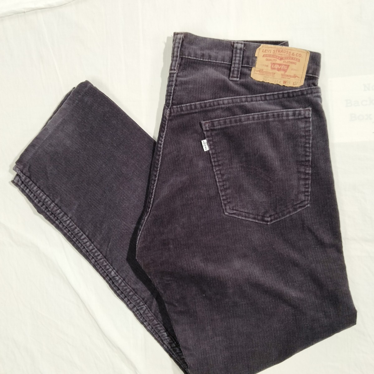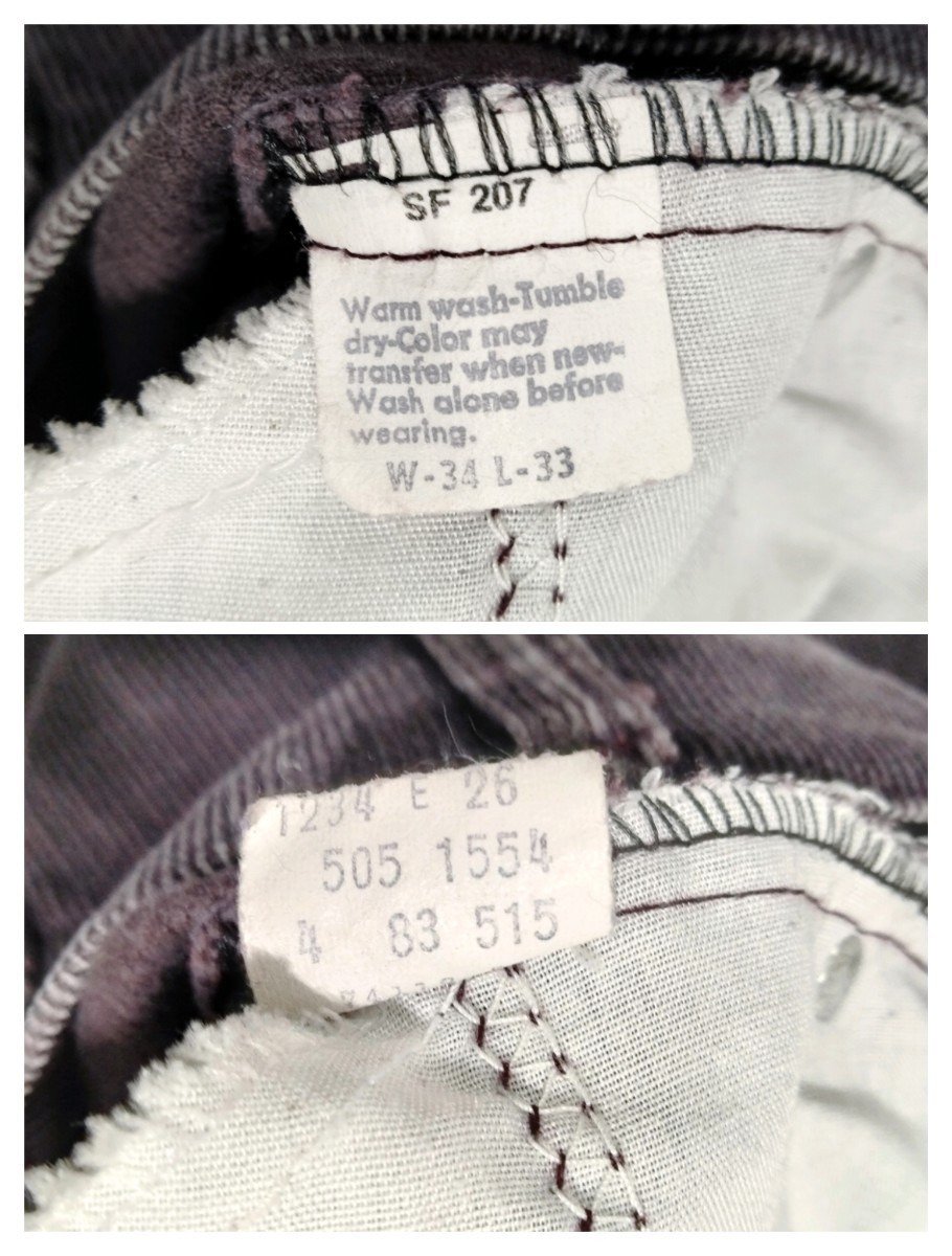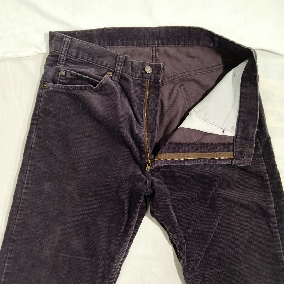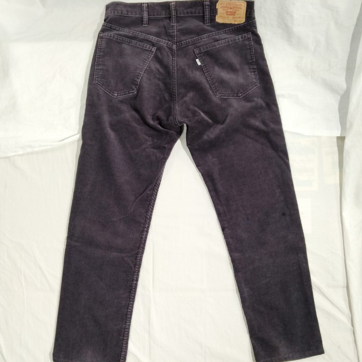 used 全体的色落ち、左右太もも部分横ヒゲあたりアリ、裾丈上げあり。右足ひざ裏あたりやや部分的色濃い部分ありますがあまり目立ちません。全体的程度良好。内側ケアタグから、83年アメリカ製