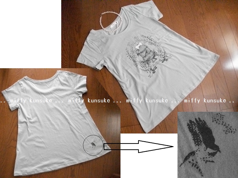 鳥かごの中の鳥と周囲の花柄がキュートなデザインの半袖カットソーです。