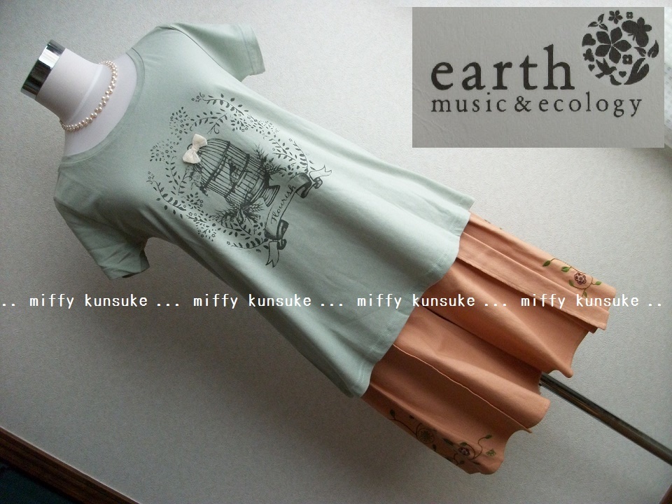 新品◆earth music&ecology 鳥カゴ柄とリボンのTシャツ◆翡翠色