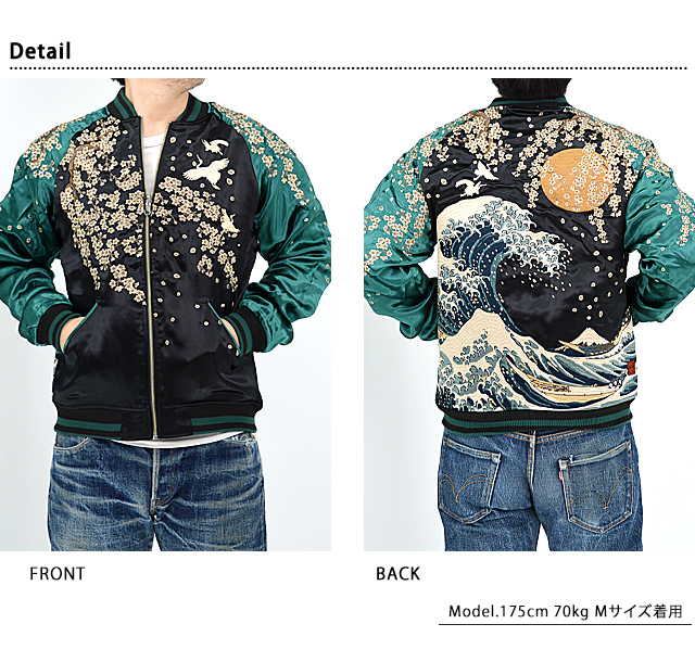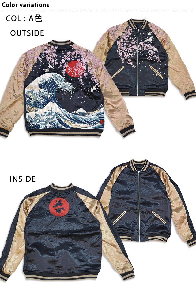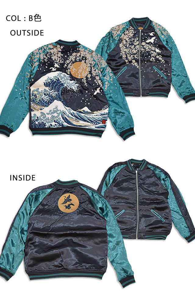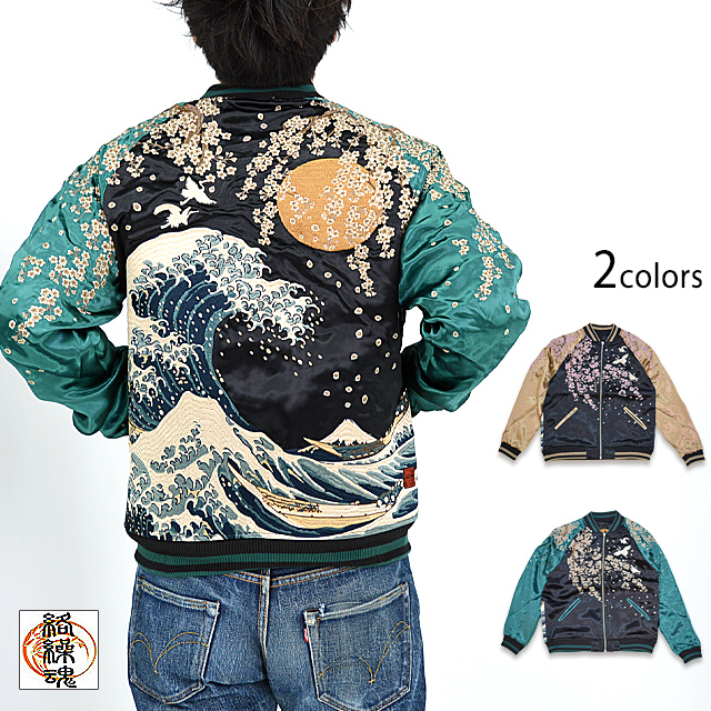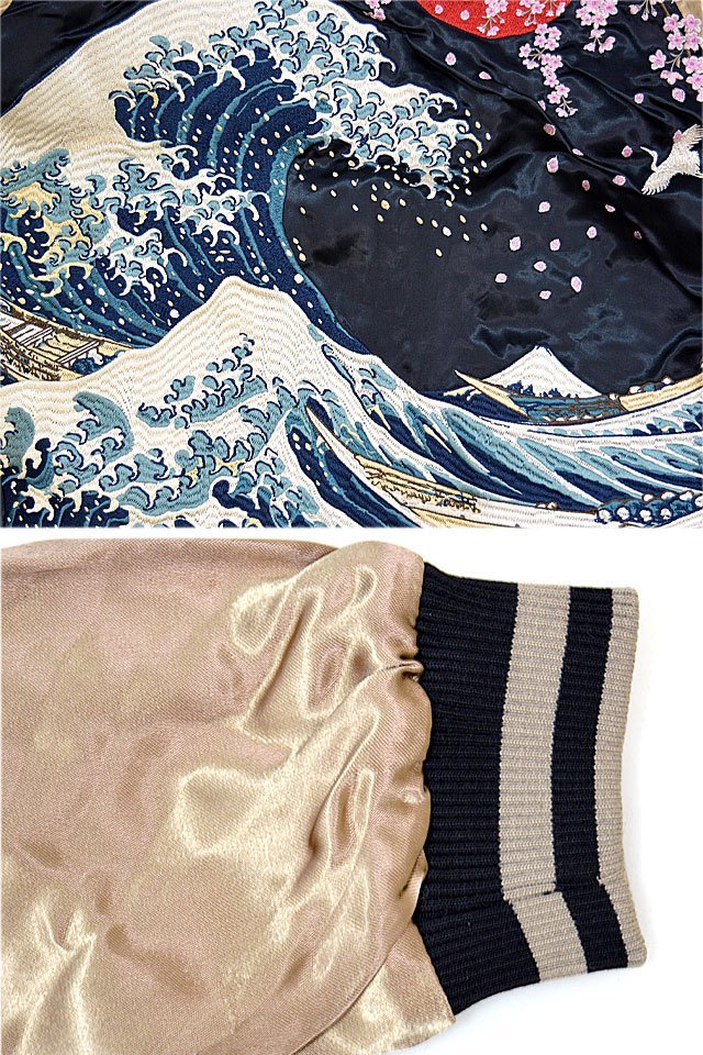 絡繰魂さんから「粋・神奈川沖浪裏 浮世絵リバーシブルスカジャン(232031)」のご紹介です。 重みを感じる程の刺繍量が魅力的な絡繰魂から、最新作のスカジャンが登場しました。 今回はあの有名な作品をスカジャンに落とし込みました。 表面はしっかり柄の入ったスカジャンですが、対象的に裏面はシンプルに仕上げ、メリハリを付けました。 ボディーにはレーヨンサテンを使用し、ドレープや陰影がくっきりと現れています。 | ||||||||||||||||||||