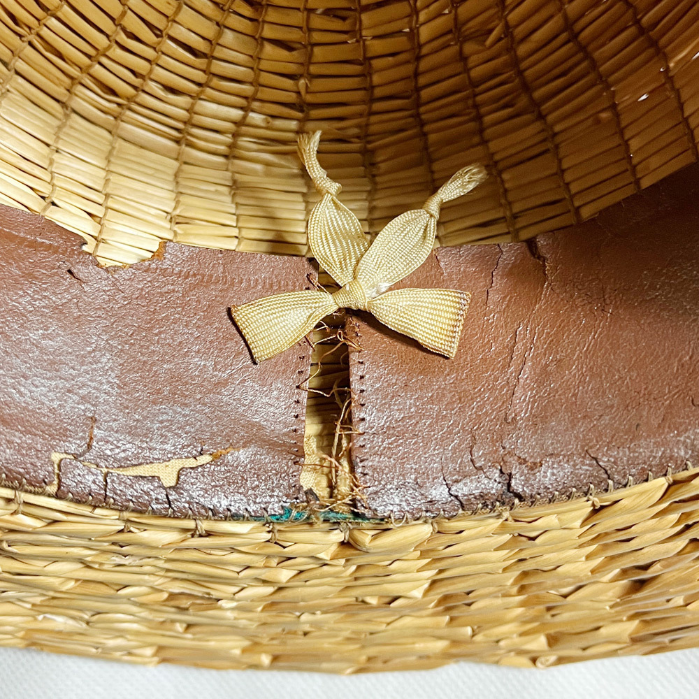 状態はブリム先に若干スレあり、ボディに若干の歪みあり、天裏装飾に汚れあり、レザースベリ後方部留め付けステッチが解れており、スベリにヒビ割れや若干の亀裂、使用感と白っぽい汚れはありますが、通常使用には問題レベルのヴィンテージコンディションです。