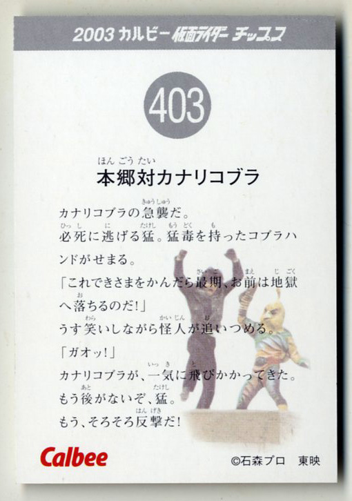 | ◆防水対策 厚紙補強 カルビー 仮面ライダーチップスカード(2003 復刻版) 403番 本郷対カナリコブラ トレカ 即決 | |