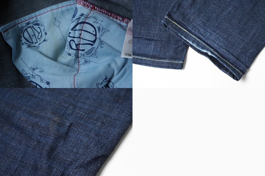 裾にスレダメージ、左膝付近前後に汚れ、内側にシミ汚れがございます。ユーズド品に理解があれば問題ない状態です