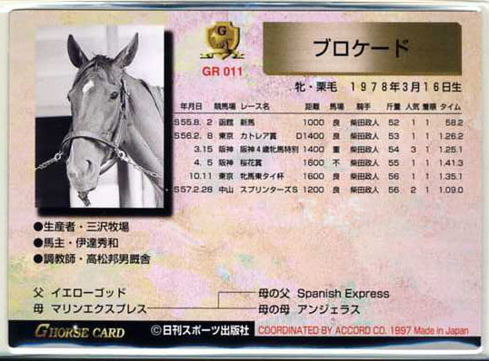 | ★ブロケード キラカード GR011 日刊スポーツ Gホースカード 97 SPRING 柴田政人 桜花賞馬 写真 画像 競馬カード 即決 | |