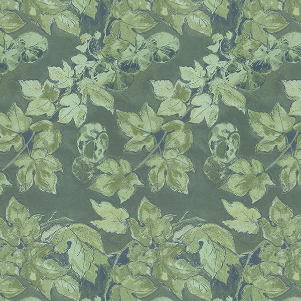 瑞々しい葡萄の葉とつるが幾重にも重なる奥行きを感じるデザイン。緑色の濃淡に見られる織物組織の複雑さや、葉脈の姿綴じの表現の緻密さが独特の美しさを放ちます。織り技術が際立つ一品。
