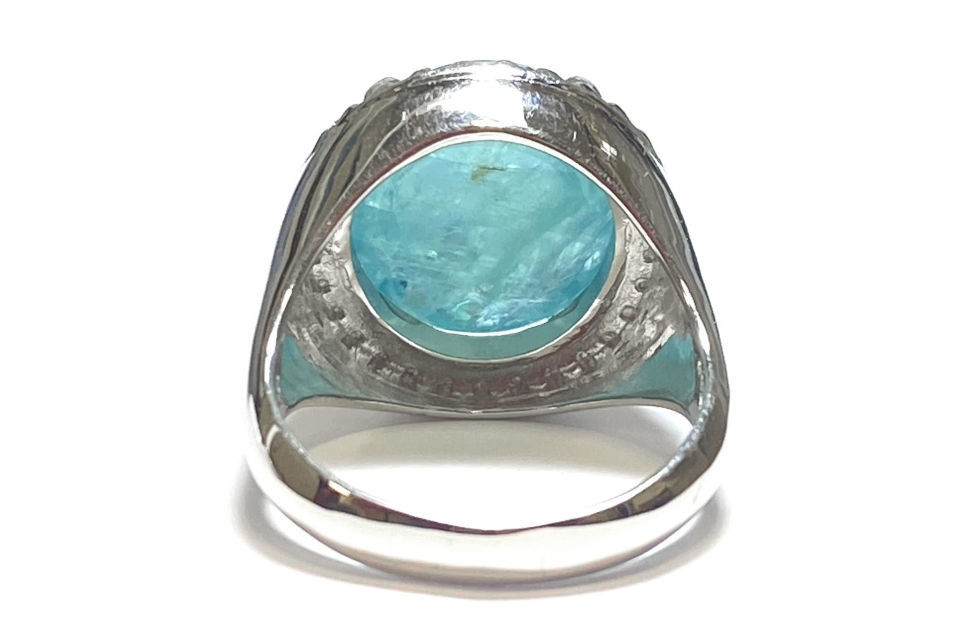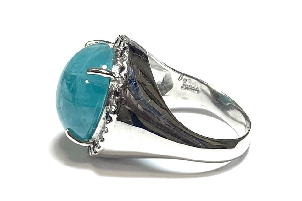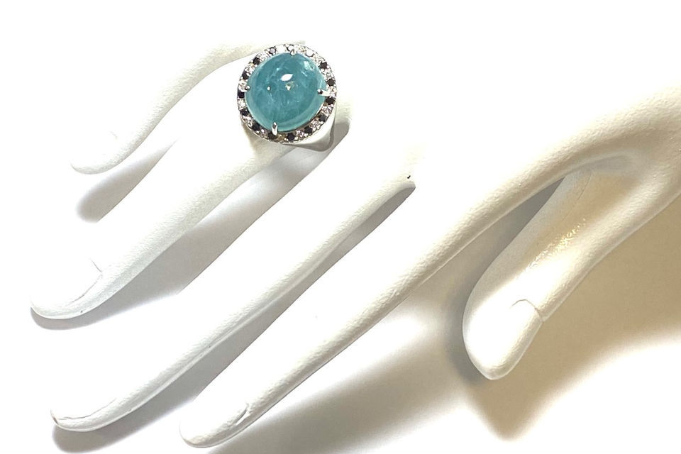 解説 | マダガスカル南部でのみ採掘される稀少石。1ct以上のファセットカットにできるグレードのものは非常にレア。カボションであっても11ctは稀有!渋い錆浅葱(さびあさぎ)色が、玄妙なる幽玄美を醸し出します。コレクターこだわりの特注品。 |