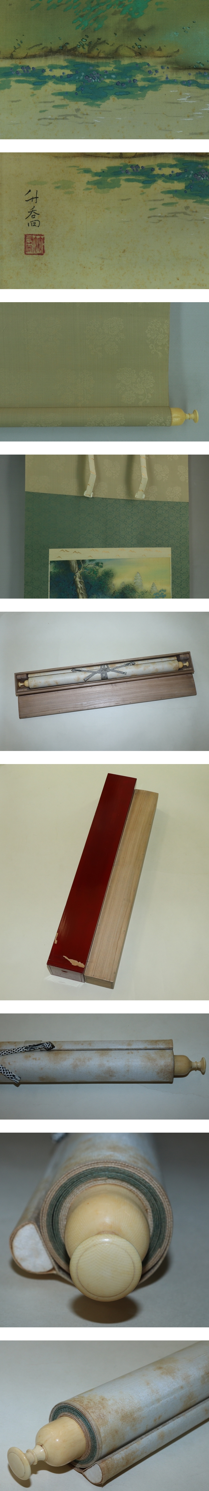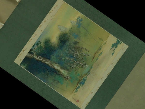 小野竹喬 おの-ちっきょう(1889-1979) 日本画家。岡山県生。名は英吉。竹内栖鳳の門に学ぶ。 大正7年土田麦僊らと国画創作協会を創立。 帝展・新文展で活躍し、戦後は日展で重きを成す。一貫して日本の自然に取り組み 清澄な透明感の中に豊かな詩情と独特の滋味のある画風で、 風景画の分野に確固とした新視覚を示し続けた。京都絵専教授。 芸術院会員。文化功労者。文化勲章受章。昭和54年(1979)歿、89才。 本紙は、染み、軽い皺があります。 表装は、染み、汚れ、軽い皺、軸先に汚れがあります。 【サイズ】 作品 横約39cm×縦約37.5cm 表装 横約52cm×縦約133.5cm |