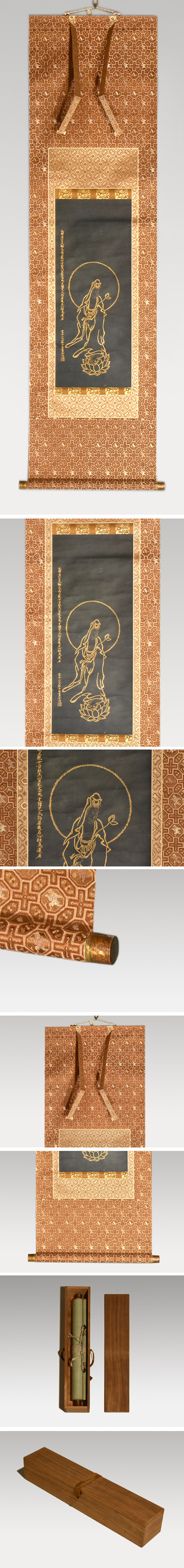【真作】雲水小比丘祖全謹書 紺紙金泥 般若心経で観音図です。 紺紙に金泥で般若心経で輪花高王観音図が見事に描かれております。 豪華な金襴表具で軸先も彫金に鍍金が施されております。 巻しわはございますがおおむね良い状態です。 |