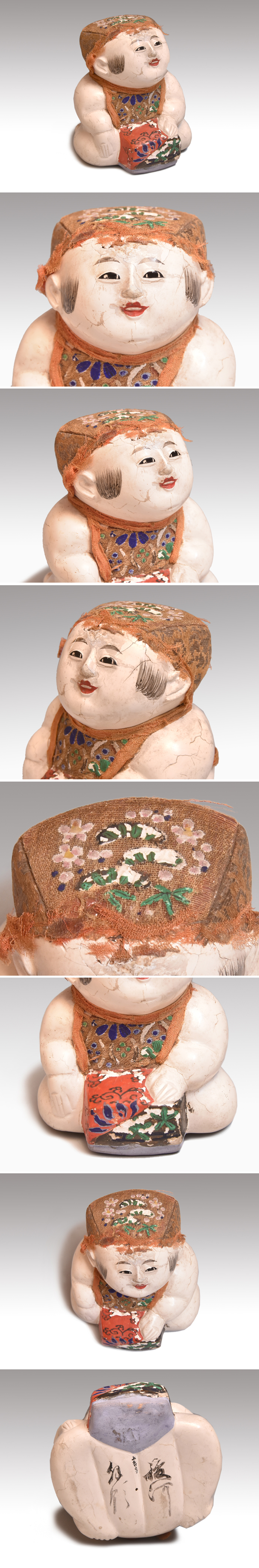 幕末頃の御所人形と思われますが顔に胡粉の割れ補修跡や絵の具の剥落等がございます。 底に古い墨書きが書かれております。 ※撮影の際に生じた写り込みなどがございます。 ご理解の程よろしくお願い致します。 |