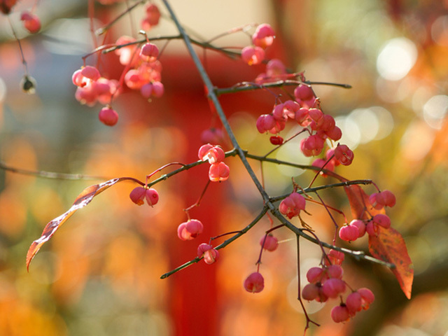マユミは5m程度になる落葉樹です。花は緑色であまり目立ちません。11月ごろに2センチ程度の四角い赤い実が沢山なり鳥を呼びます。実ははじけて4つの種が出ます。種には毒があり食用には向きません。秋には黄葉し実と葉のコントラストが美しいです。一年目の幹は緑色をしています。葉は鮮やかな緑色をしています。名前の由来は材木が強い上、よくしなるので弓に使われてきたことからです。