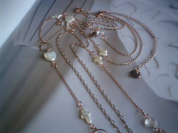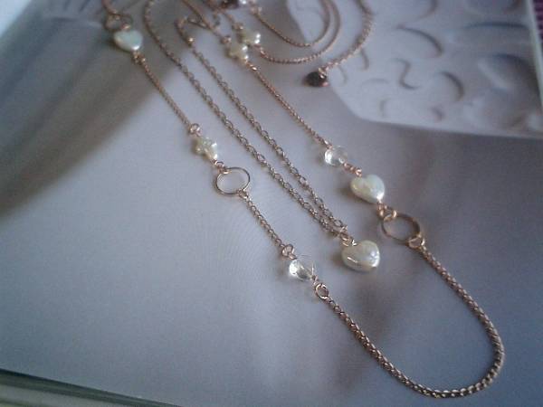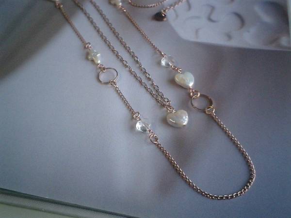 可愛いお気に入り・・シリーズです♪ハート&ハート・・淡水パールと水晶のネックレス2本セットです♪小さなハートやクロスが可憐な表情です♪長い方のネックレスは10ミリのハートや14ミリのクロスの淡水パール、8ミリのカットハートの水晶にピンクゴールドのリングやチェーンを合わせました♪長さは全長115センチ位で調節自由です♪2連にされても素敵です♪シンプルなネックレスは10ミリのハートの淡水パールに華奢なピンクゴールドのチェーンを合わせました♪長さは全長75センチ位で調節自由です♪チョーカー風にされても素敵です♪それぞれ単品やお揃いのブレスレットやピアスも出品しています♪シンプルで飽きのこないいつまでも着けられるデザインを考えて作りました!ハンドメイドをご理解頂いてノークレーム、ノーリターンでお願いします |