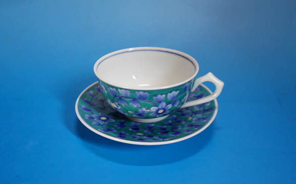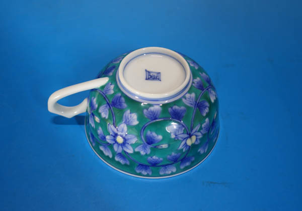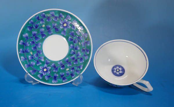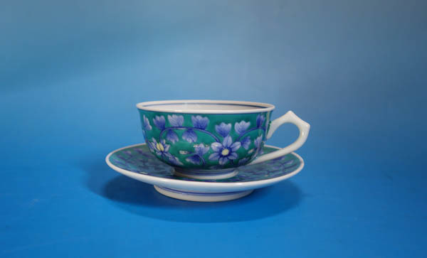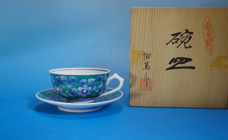 有田焼 古伊万里様式 畑萬陶苑 染錦 緑青釉 草花文 碗皿 カップ&ソーサー 共箱