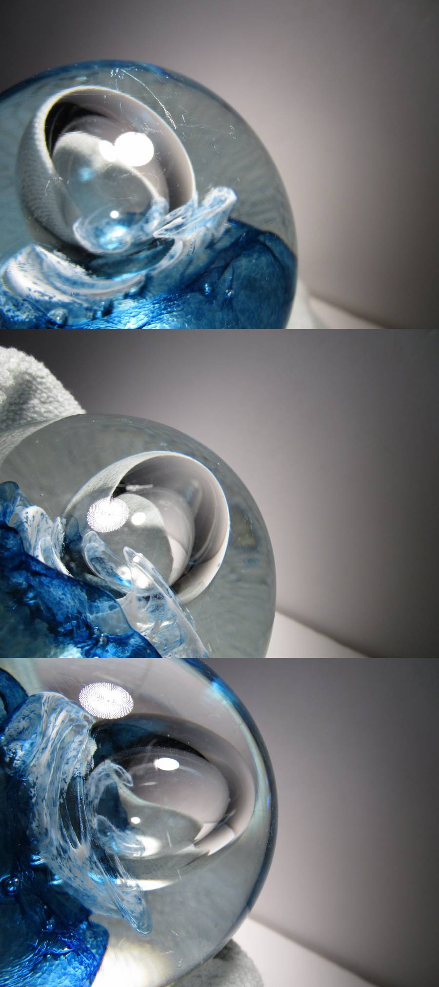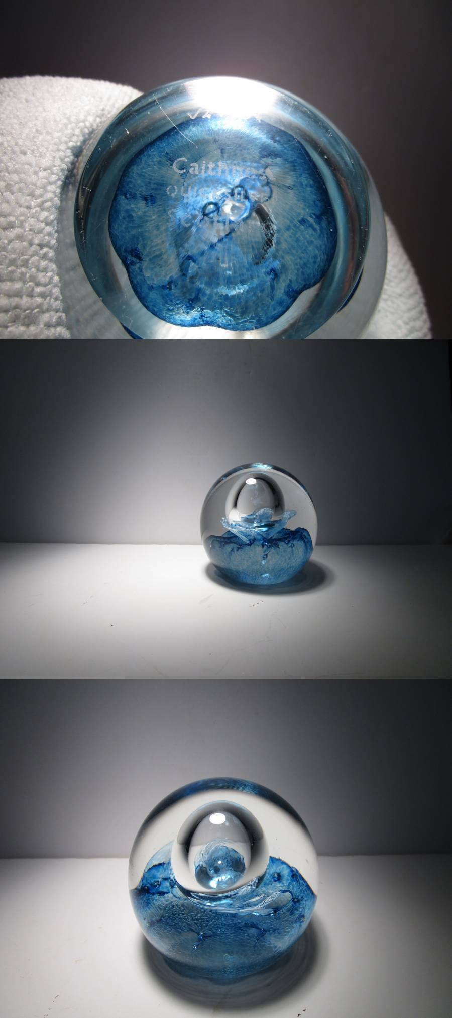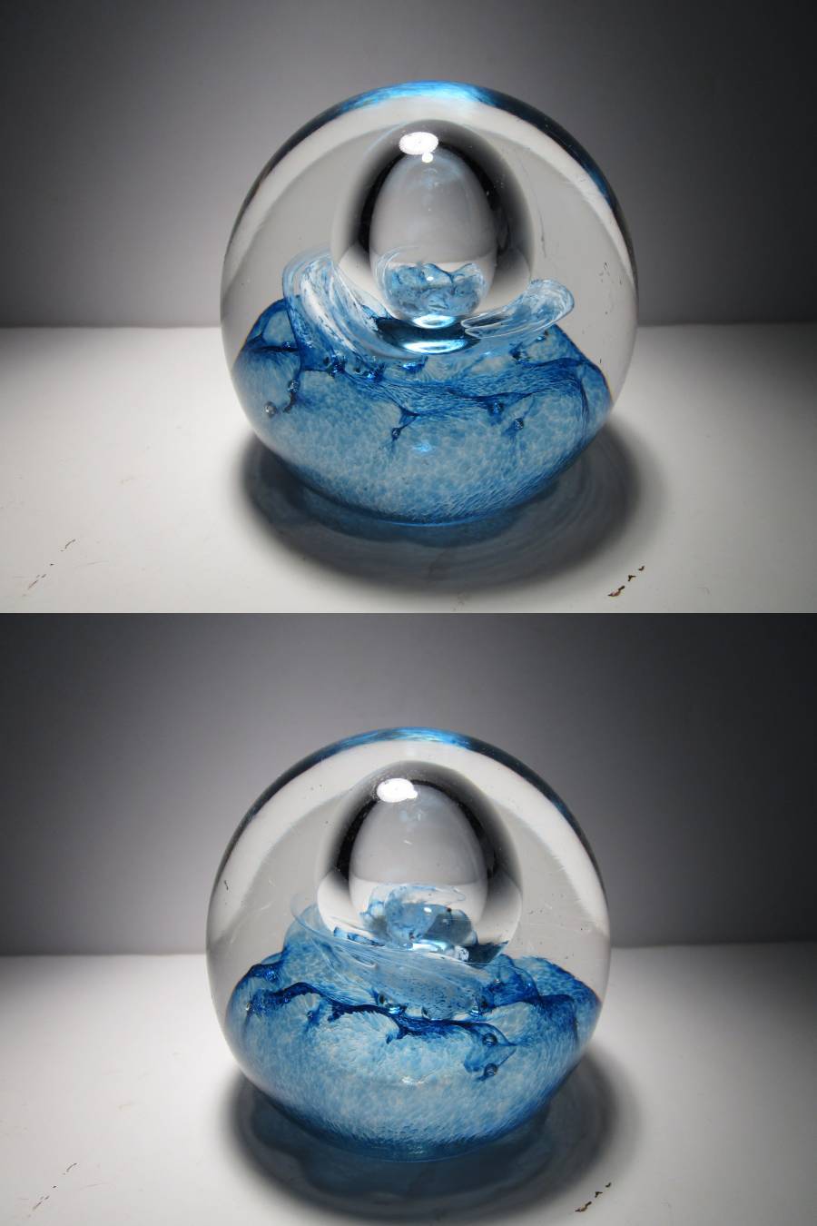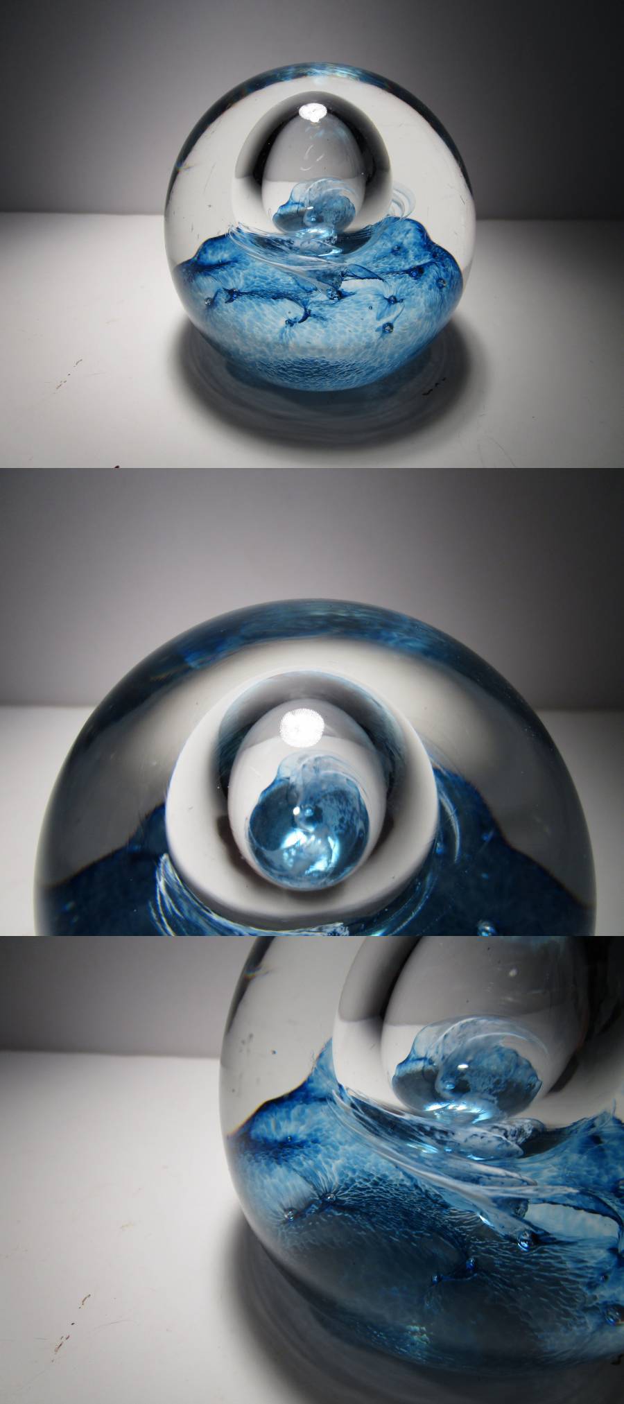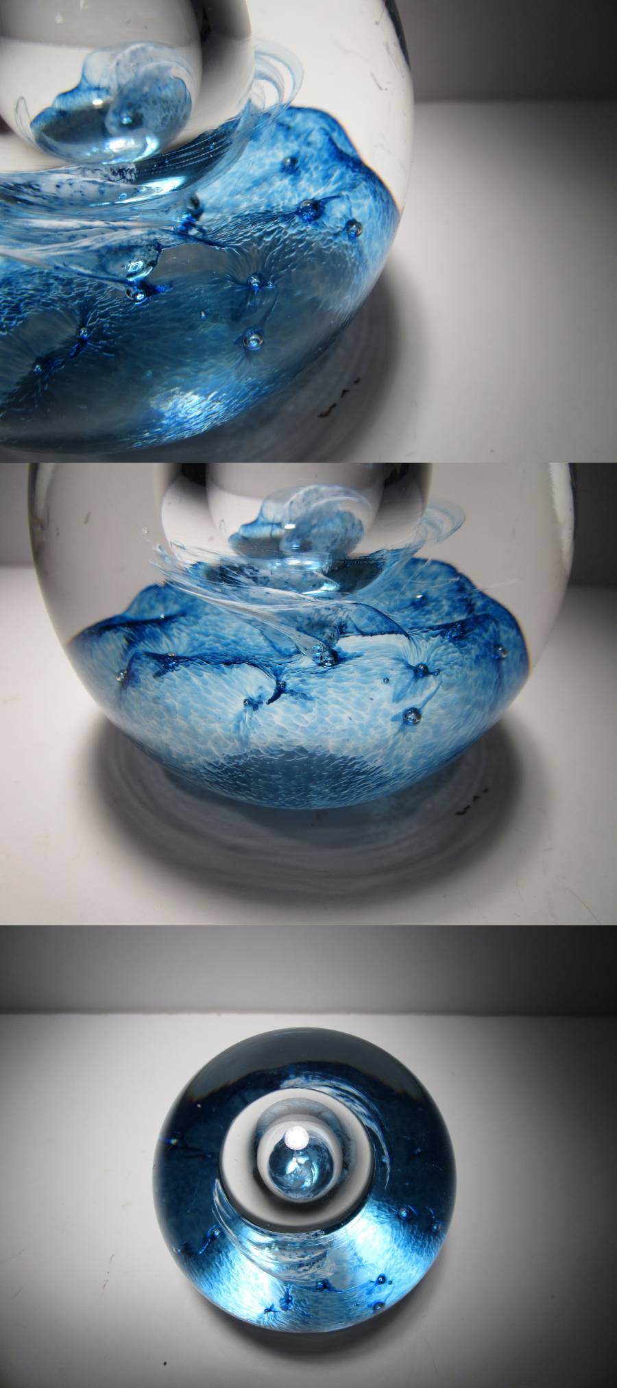 Quick Silver(アメリカコミックのキャラクター?)という名の作品。作品名とデザインの関係は今一つ不詳ですが、オーソドックスな球体の底面に広がるマリンブルーの垂れ幕、その上の大き目の気泡、それを包むようにしつらえられた白の渦巻、それらが織りなす有機的なデザインが印象的な1品。ケイスネスらしい水や大気を感じさせてくれるよくできた作品です。