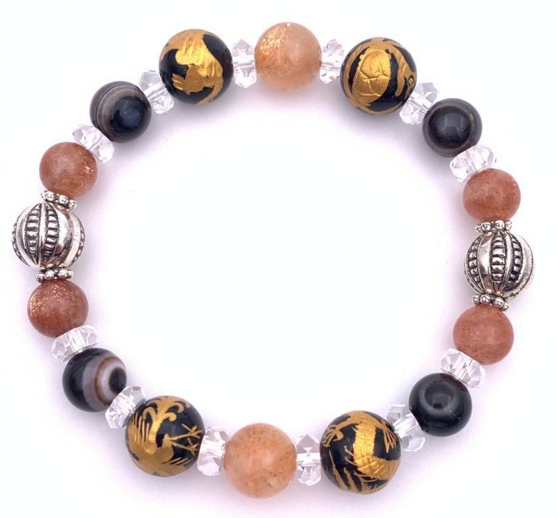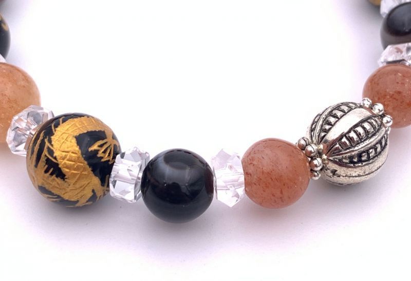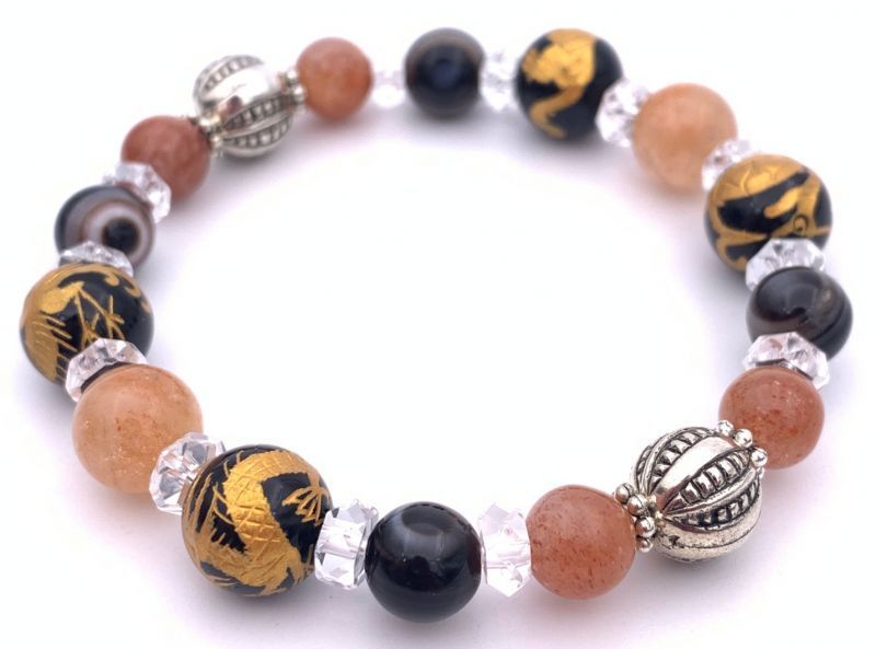 風水四神!天然石金彫りオニキス10mm玉&サンストーン&天眼石のブレスレット