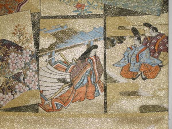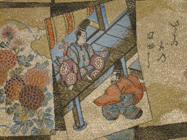 仕立てつき訪問着帯  西陣6通柄袋帯 金地(カルタとカルタの間は墨地に金、裏地くすみ薄金) 絹100%(新表示:絹80%指定外繊維(紙、金属糸風)20%)  新品み仕立て品ですがこのお値段で仕立てつきで、納品です。なお、最終日まで待っていただかなくとも、入札した時点でオークションは終了し落札者となります。お値段的にもお安く設定いたしましたお買い得品です(西陣帯です)。もちろん綿芯込みの仕立て付きですが、仕立てなしの場合でも金額は変わりません。