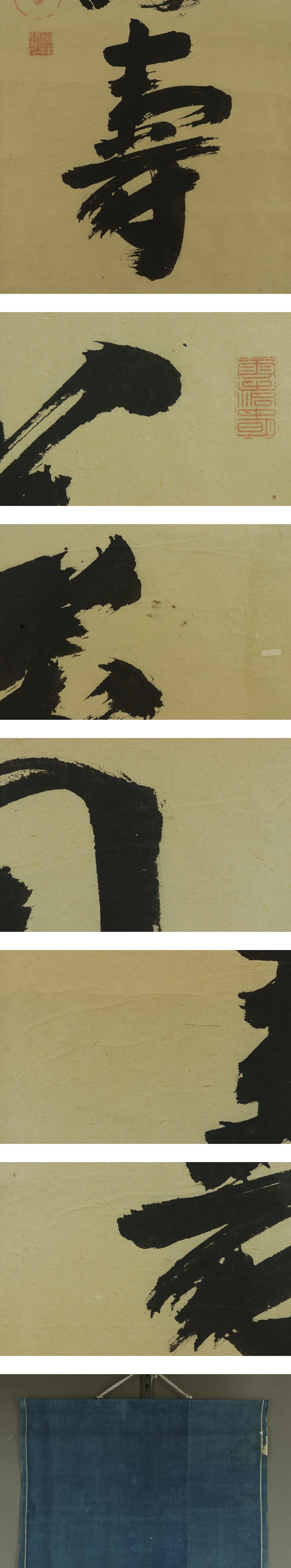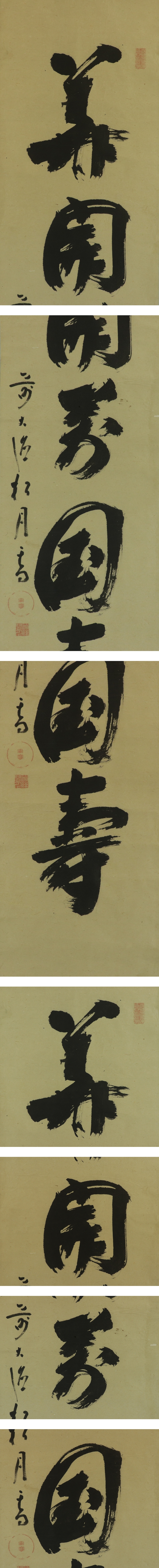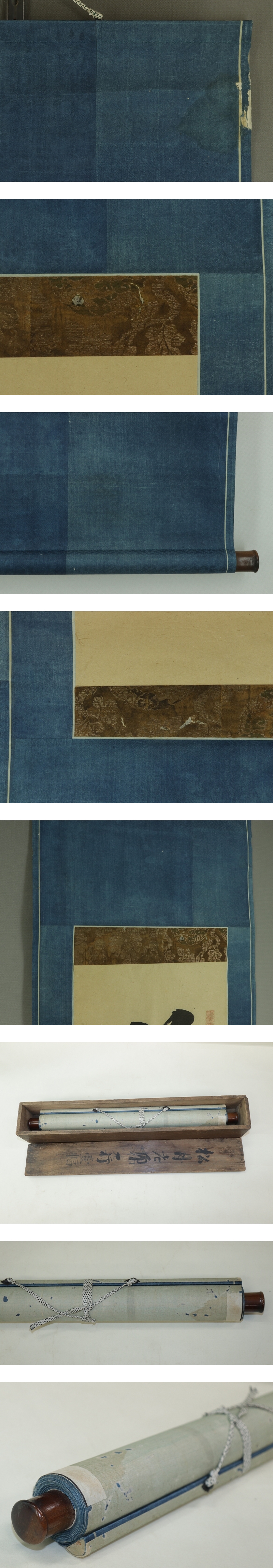 宙宝宗宇 ちゅうほう-そうう 江戸後期の臨済宗の僧。 大徳寺四百十八世。京都生。宙宝は道号、宗宇は諱、松月老人と号する。 大徳寺四百六世則道宗軌に就いてその法を嗣ぐ。 天保7年仁孝天皇より大光真照禅師の号を賜る。天保9年(1838)寂、79才。 本紙は、折れ、皺、浮き、破れ痕があります。 表装は、染み、汚れ、折れ、皺、虫食い、ほつれ、軸先に軽い汚れがあり、紐に傷みがあります。 【サイズ】 作品 横約28.5cm×縦約132cm 表装 横約41.5cm×縦約197cm  |