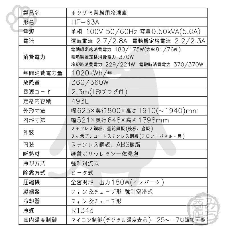 HF-63A-1 ホシザキ 縦型 2ドア 冷凍庫 100V 別料金で 設置 入替 回収 処分 廃棄