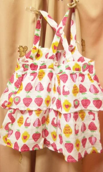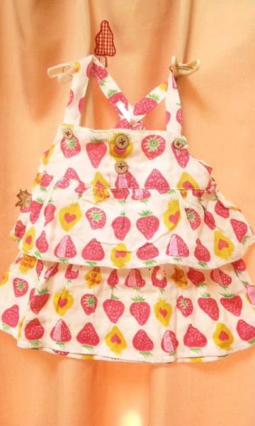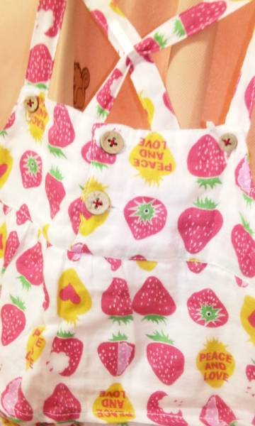 ◆ナチュラルなダブルガーゼ素材に綺麗なピンクのイチゴ総柄♪肩紐はバッククロス♪胸元はウッドボタンに赤糸♪ヒラッとフレアーな2段フリルも可愛いチュニックキャミソール♪