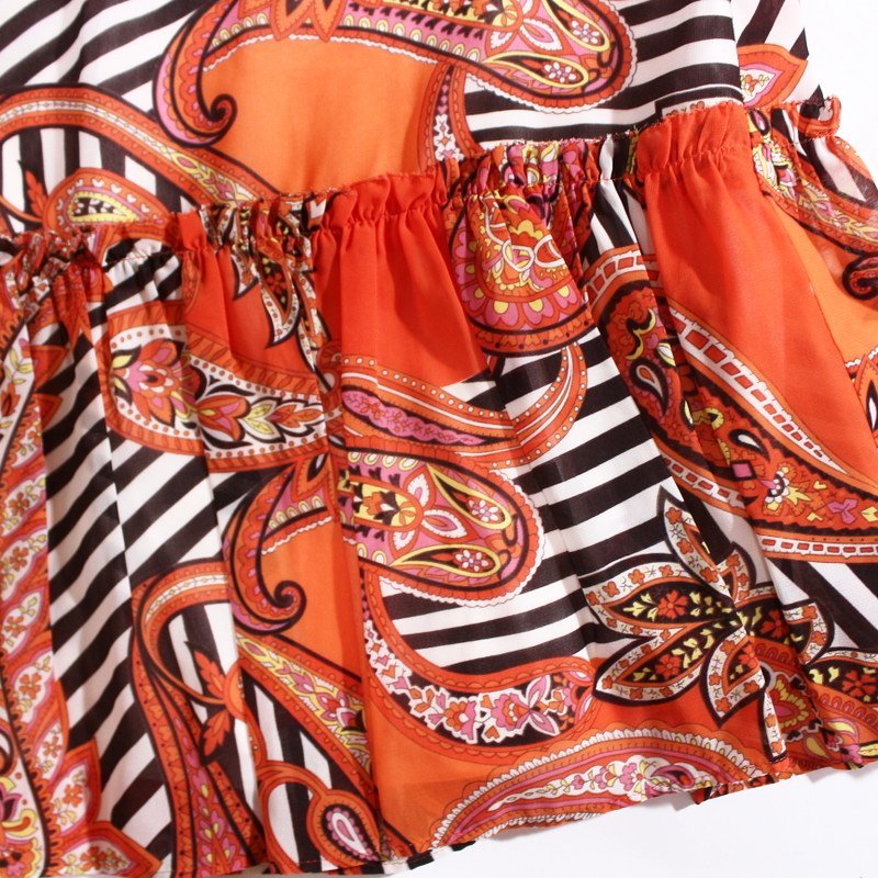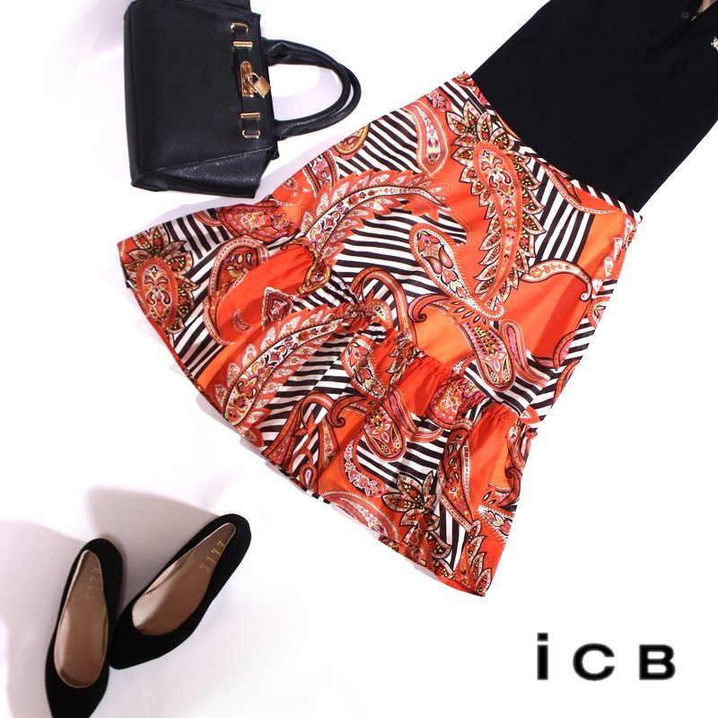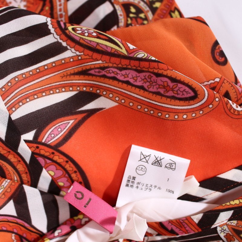 美品 ICB アイシービー 株) オンワード樫山 ■ 春 夏 イラスト ペイズリー 柄 シフォンスカート フレアスカート 2 9号 オレンジ ブラック