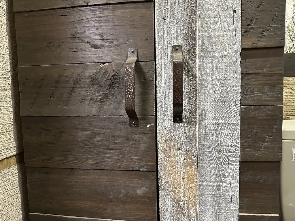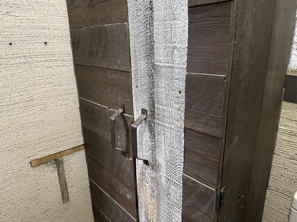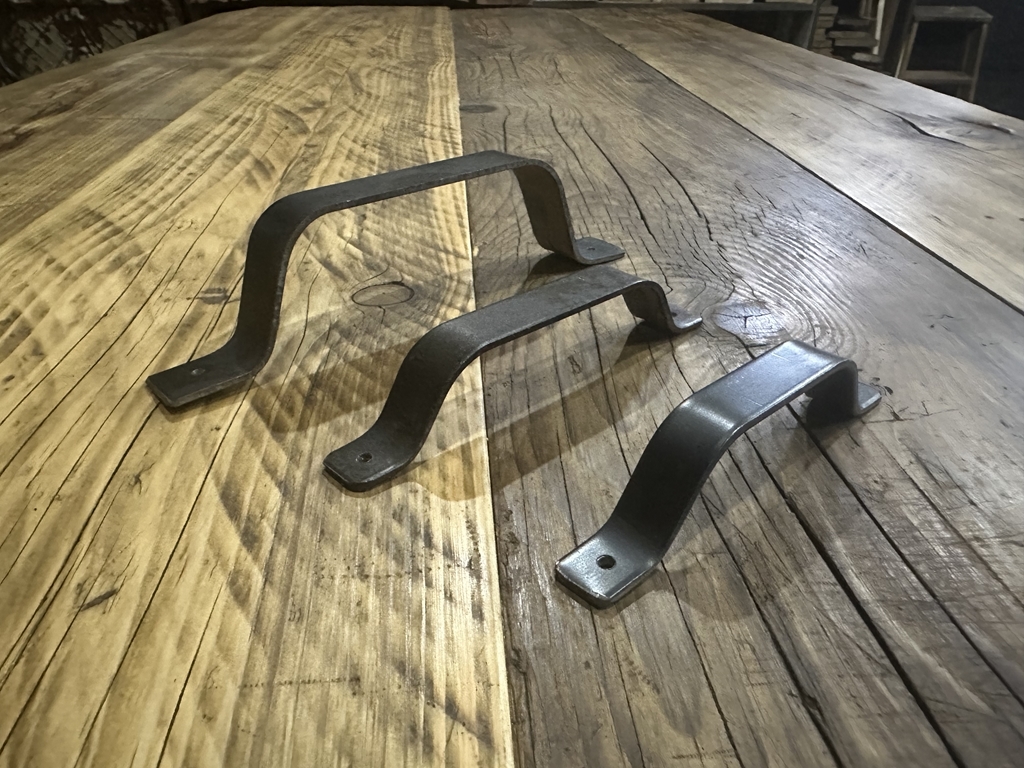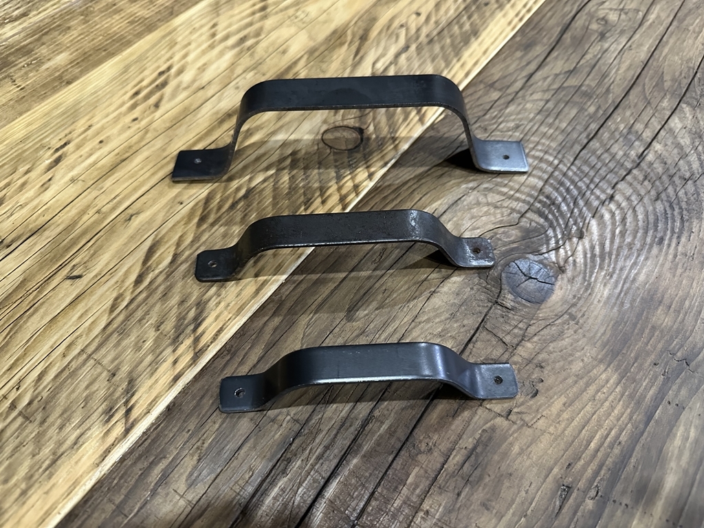 ・厚み2mmのフラットバーを曲げたドアハンドル。鉄の存在感を生かしたシンプルなデザイン。
