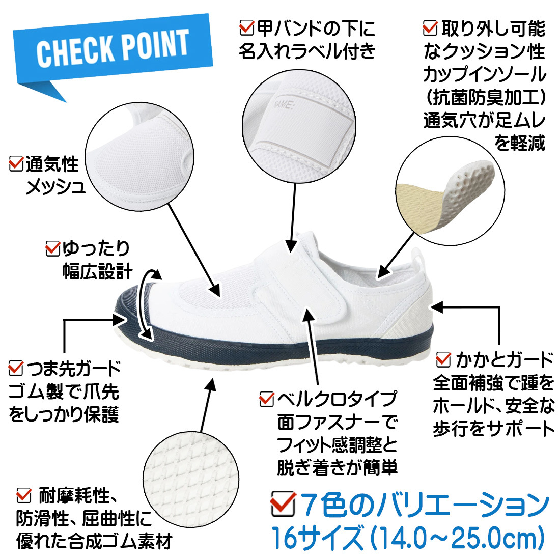ベルクロ (マジックテープ) タイプのメッシュ上履き。