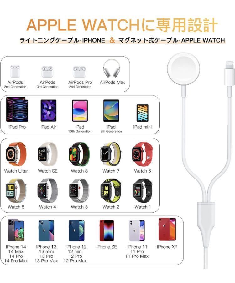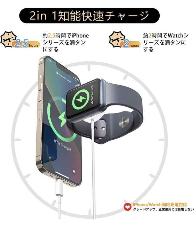 【2in1充電】Watch充電器は、WatchとPhoneを同時に充電可能!最新のiosシステムに対応可能で、システムがアップデートされてもご心配なく、本制品は自動的にアップデートされます。Appleの最新機種iPhone 14/13 14Pro ProMax/13 Mini/12/12 対応可能です。Apple Watchの全シリーズも対応できます。自宅、オフィス、車内等色々な場所で、1本だけを持つと十分。家庭と仕事にピッタリです、置くだけで充電可能になります、急速なワイヤレス充電の体験を現実できます。(5V/2AアダプターまたはApple Watchオリジナルアダプターを使用してください。そうしないと、充電効果に影響します。)