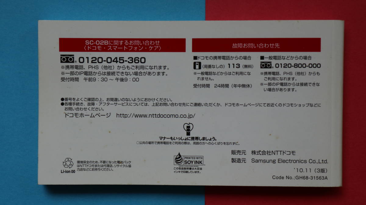 中古 docomo スマートフォン GALAXY S SC-02B の取扱説明書です