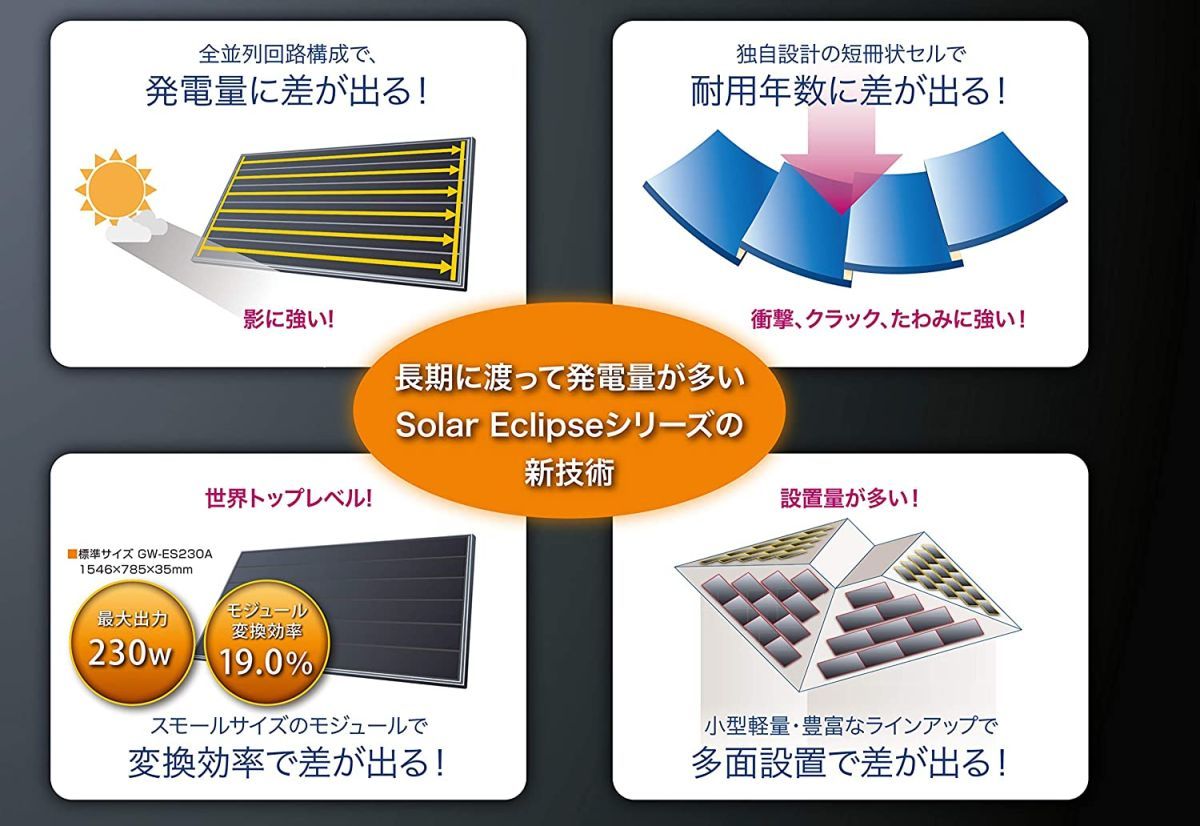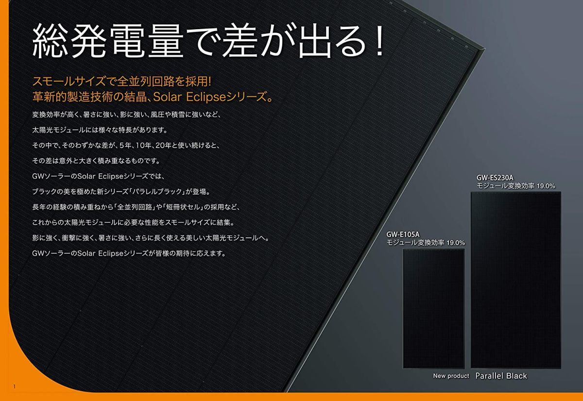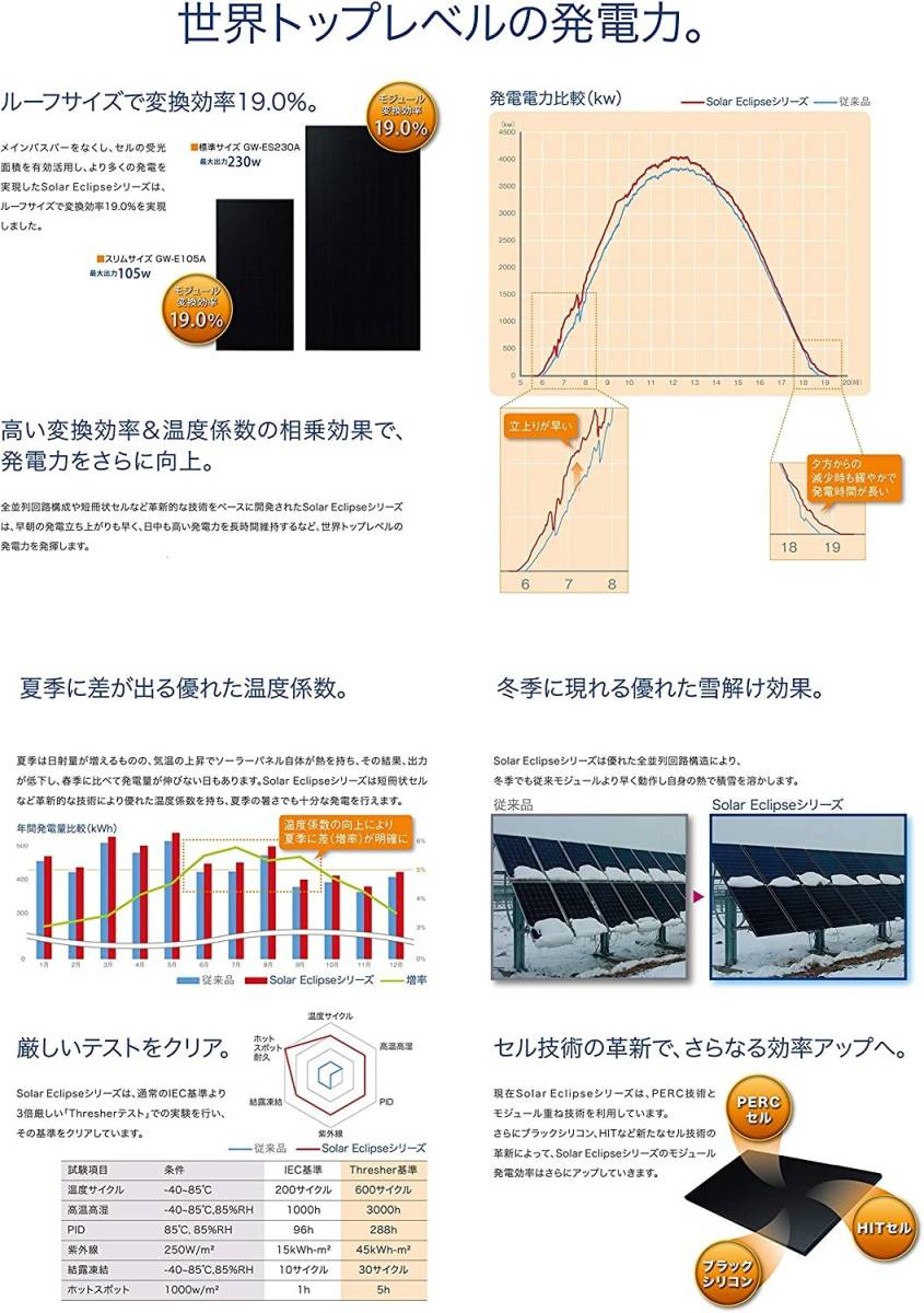• ★【影に強い理由】: 4列のセル列を並列で構成する独自設計 ★単結晶PERC太陽光パネル/ 汚れ、影に強い! ・バスバーレス美しいブラック仕様 (GW-E100A)