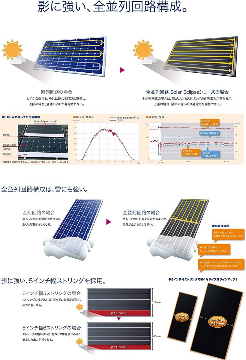 •   ★自社製、影に強い!! 【GWSOLAR 太陽光パネル100W / 全並列ソーラーパネル】【12V充電用 5.5A / 4並列】変換効率18.3% 12Vシステム充電用、革新的なセルの造り、高い発電効率を実現!国際認証TUV・JPEA登録。※日本語取扱説明書付き
