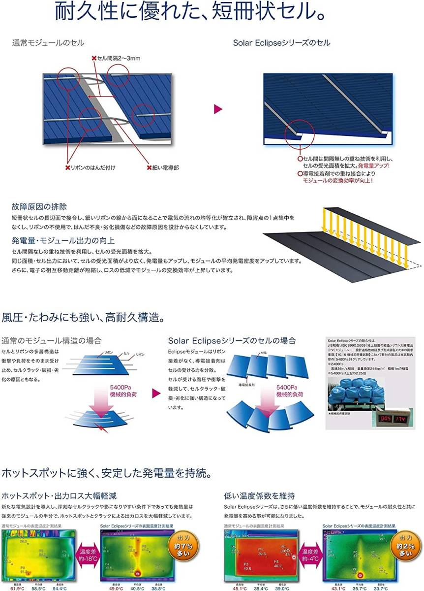 • 変換効率はJIS C 8918で規定するAM1.5、放射照度1000W/m、モジュール温度25℃での値を使用し、JISC 8960 2012の計算式を用いて算出。(※JISC8960 2012:日本工業規格のページ9,309行・実行変換効率より出典) ・2017/9にJPEAの太陽光パネルリストに登録済。詳しくは再生可能エネルギー電子申請HPにて検索下さい。「自社調べ、2017年」