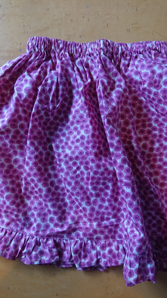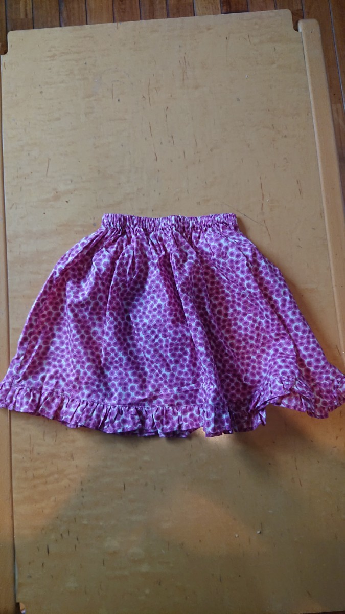 ~リバティ生地を使ったスカート。丸い柄がとてもかわいいザンジーザンビームです。裾にフリルをあしらい、歩くとゆらゆら揺れて可愛いです。色はピンクです。ウエスト42~48cm総ゴム仕様、丈35cmウエスト上から裾まで