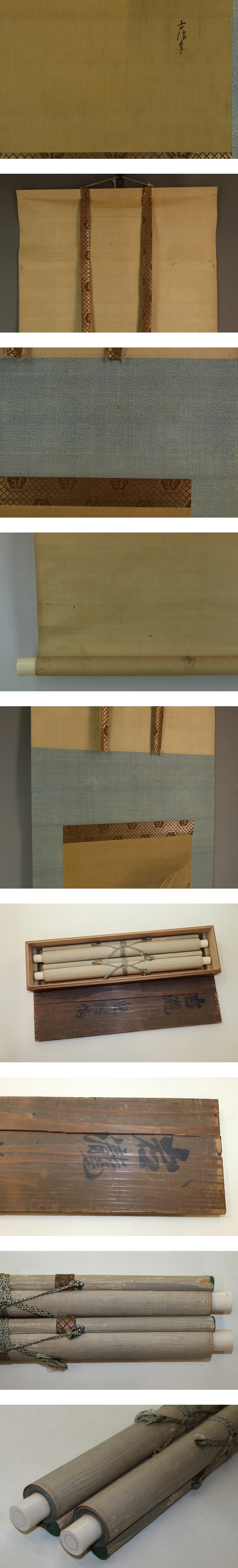 狩野古信 江戸中期の画家。木挽町狩野家五世。初名は庄三郎、号は栄川。如川周信の子。 画法を父に学ぶ。享保13年父の後を継いで幕府の絵師となる。 法印に叙せらる。享保16年(1731)歿、36才。 本紙は、染み、汚れ、強め折れ、皺、虫食い、生地剥がれ、破れ、ヤケがあります。 表装は、染み、汚れ、折れ、皺、くすみ、虫食い、破れ、ほつれ、 軸先に汚れ、紐劣化、箱に破損があります。 【サイズ】 作品 横約32.5cm×縦約92cm 表装 横約45cm×縦約193cm |