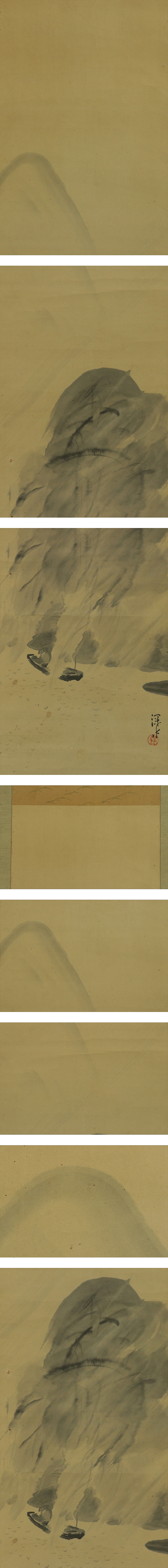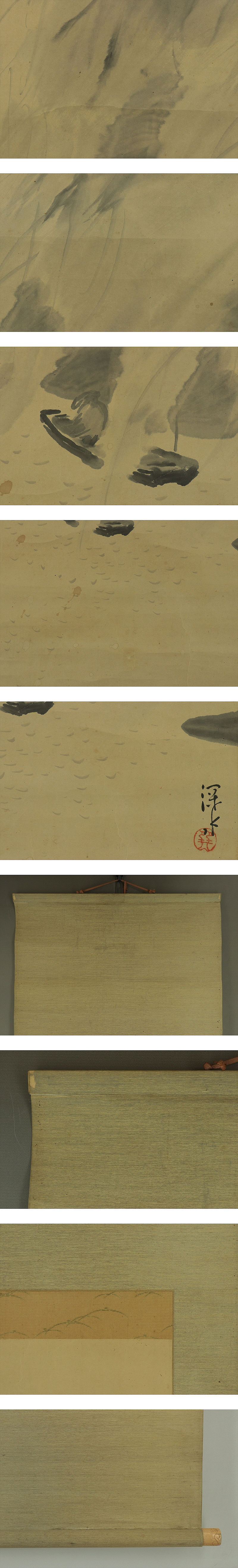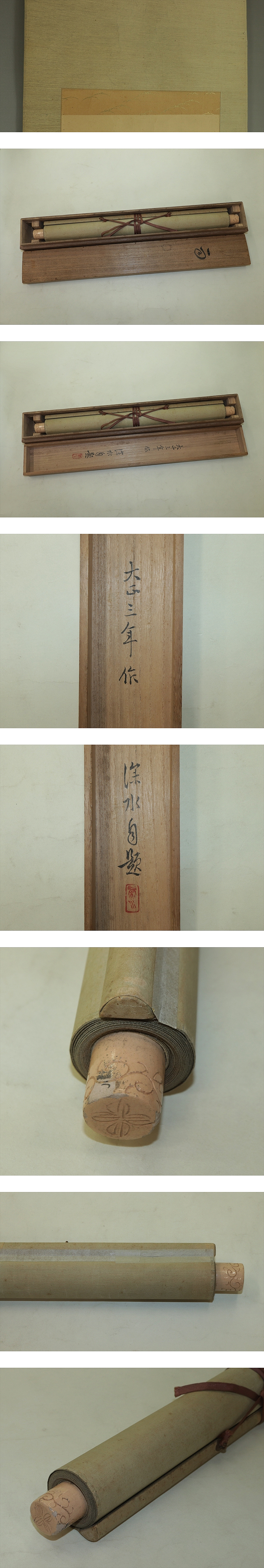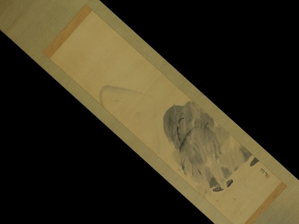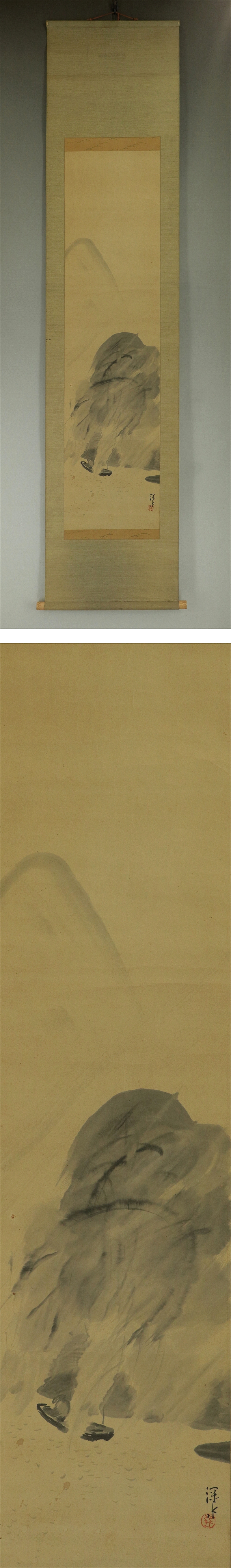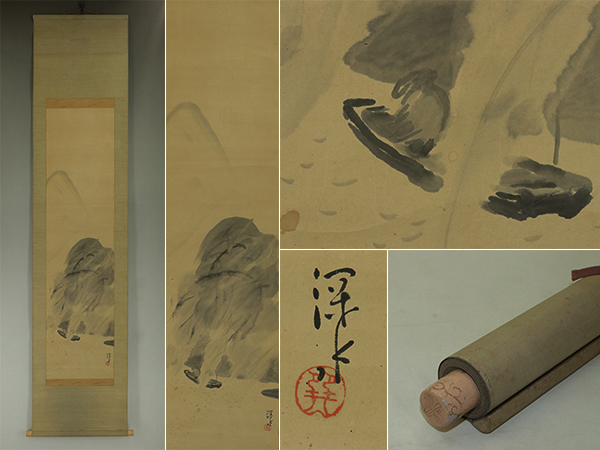 伊東深水 いとうしんすい(1898―1972) 大正-昭和時代の日本画家。明治31年2月4日生まれ。朝丘雪路の父。 鏑木(かぶらき)清方に師事して美人画をえがく。大正3年院展,4年文展に初入選。 13年郷土会展の「湯気」で名をあげる。以後官展を舞台に活躍し,帝展特選2回。 昭和23年「鏡」で芸術院賞。33年芸術院会員。昭和47年5月8日死去。74歳。 東京出身。本名は一(はじめ)。 本紙は、染み、汚れ、折れ、皺、ヤケがあります。 表装は、染み、汚れ、折れ、皺、虫食、破れ、ほつれ、修復痕、軸先に汚れと傷みがあります。 【サイズ】 作品 横約33cm×縦約131.5cm 表装 横約46cm×縦約204cm |