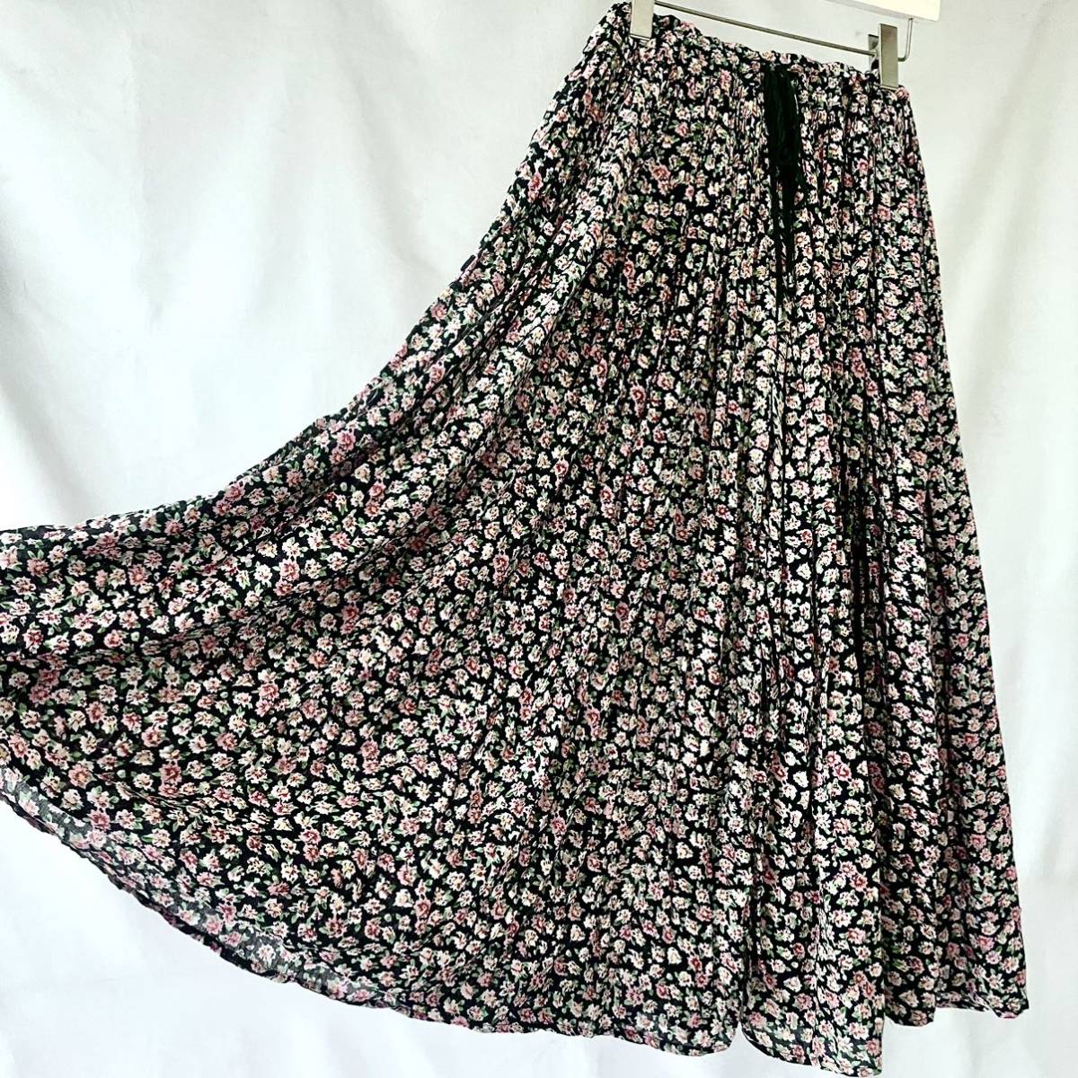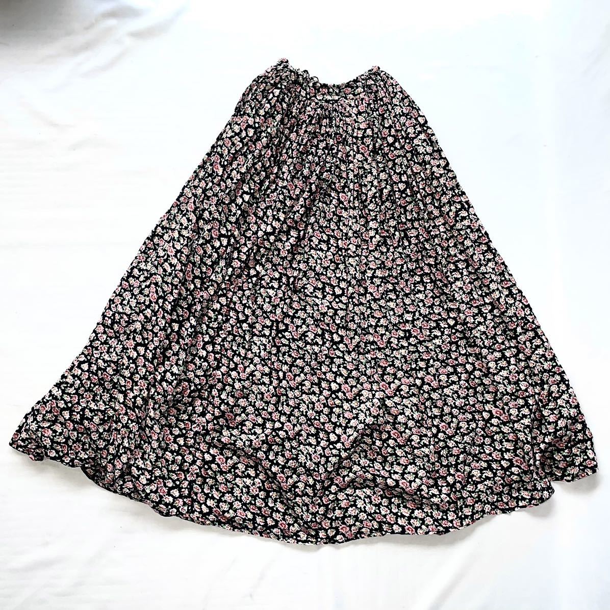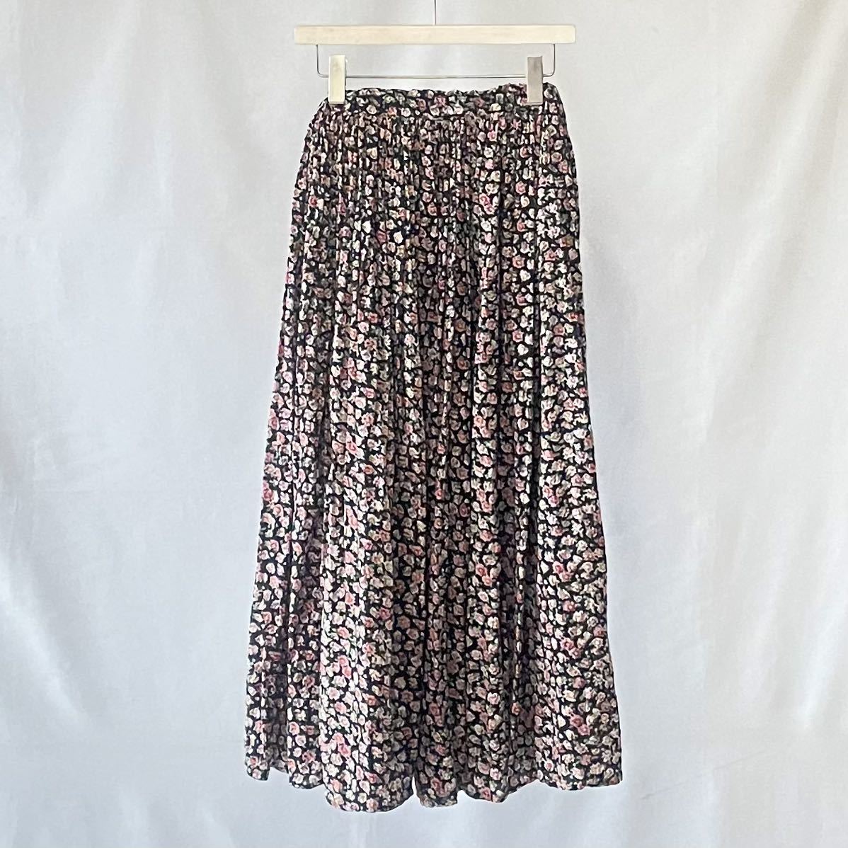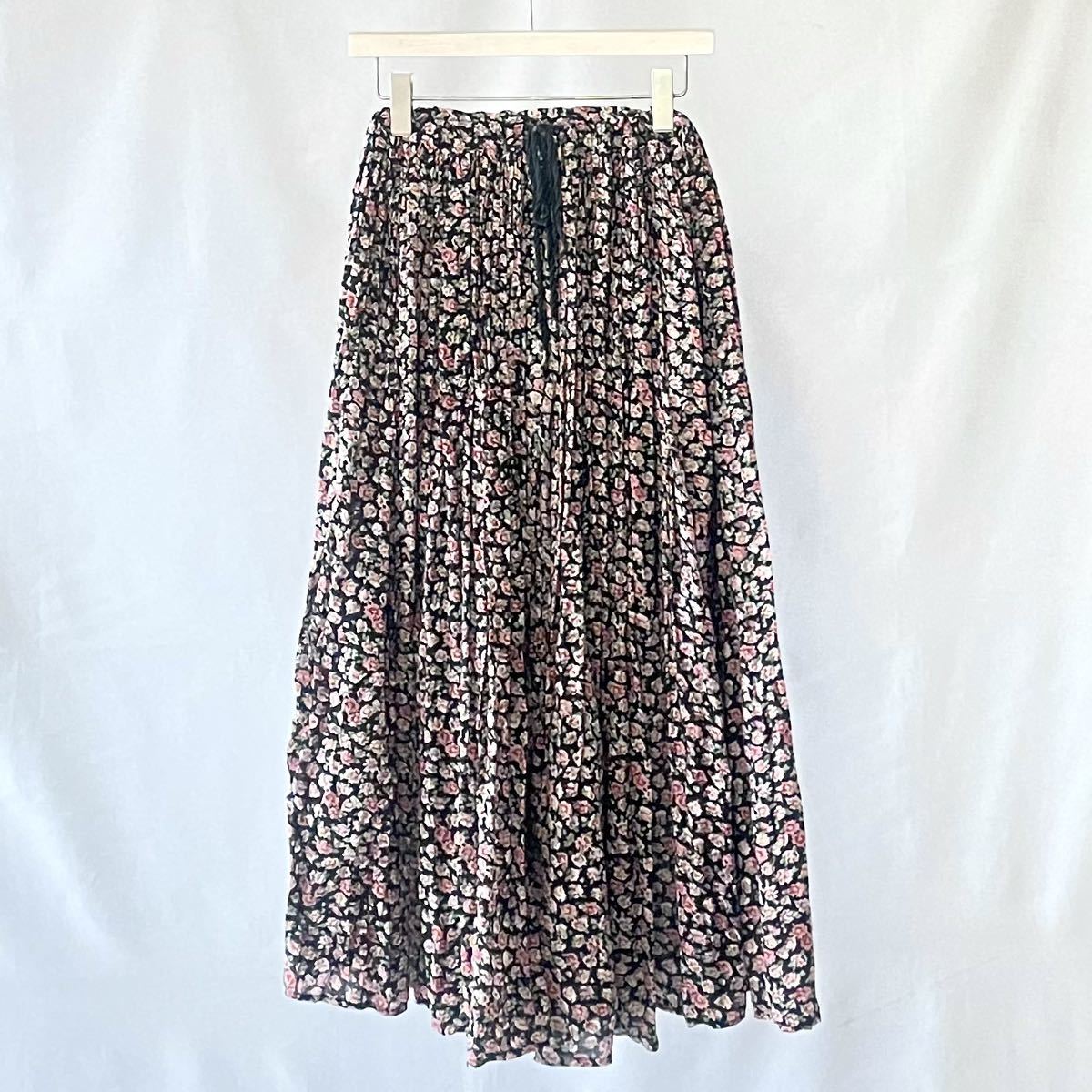 80年代頃のヴィンテージ インド綿 黒×ピンク 小花柄 ロングスカートです。ふんわりとした軽やかなコットンガーゼで、定番で可愛いです。
