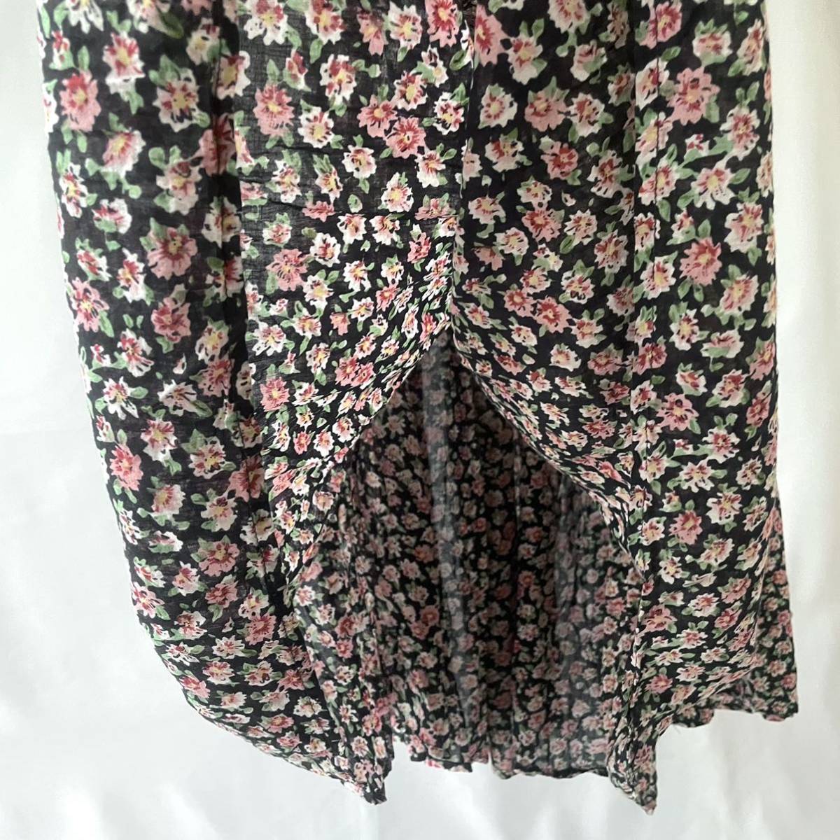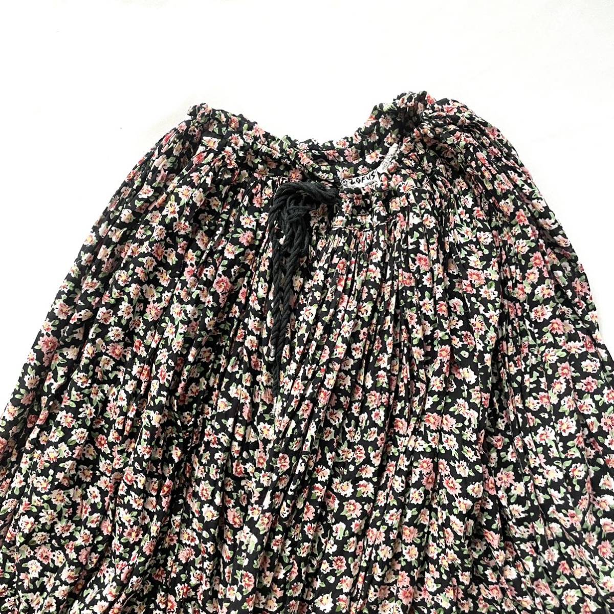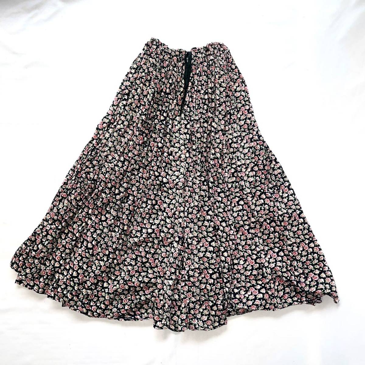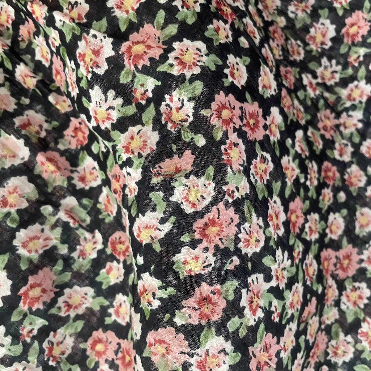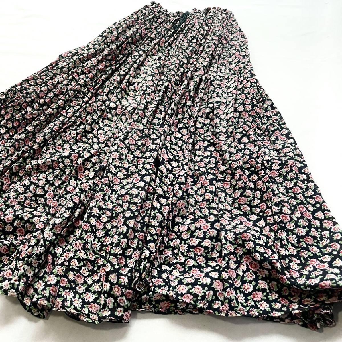 80年代頃のヴィンテージ インド綿 黒×ピンク 小花柄 ロングスカートです。ふんわりとした軽やかなコットンガーゼで、定番で可愛いです。