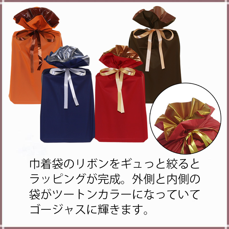 巾着袋のリボンをギュっと絞るとラッピングが完成。外側と内側の袋がツートンカラーになっていてゴージャスに輝きます。