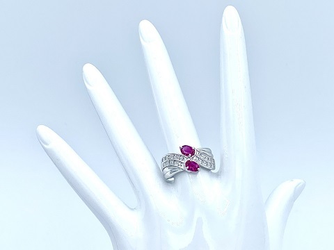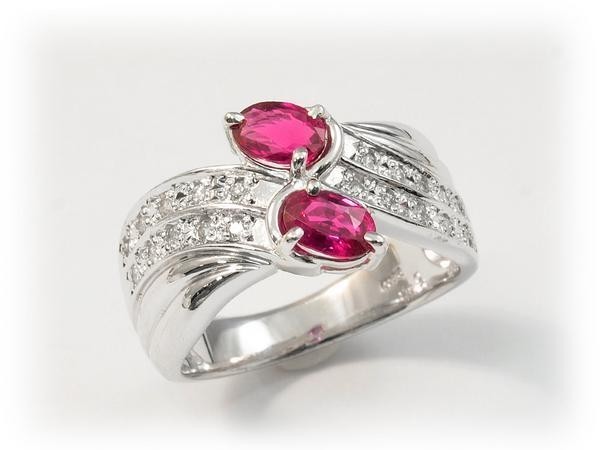 解説 | 内包物のほとんどない美しいルビーのデュオ…。尾を引いて指を包むようなデザインがとてもエレガントです。指元から香る気品をお楽しみ下さい。 |