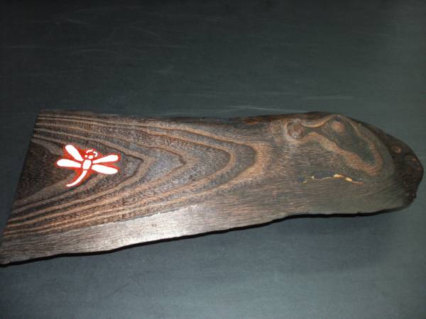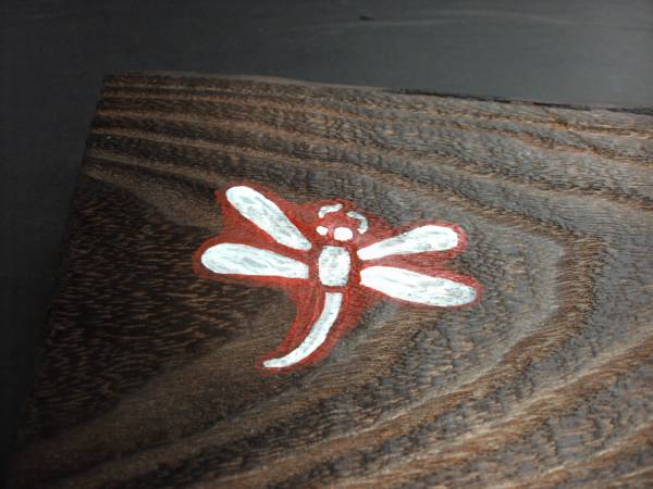 桐の一枚板を焼いて木目を浮き上がらせ、飾り台を作りました。材料の一枚板の自然の形を生かして飾り台を作っています。そしてその黒い焼桐を背景としてトンボを描き飾り台のワンポイントとしました。