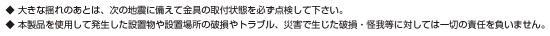 | 注意点 | 1290円(税込み)で、商品一個となります。 30サイズのみ。 ・大きな揺れのあとは、次の地震に備えて金具の取付状態を必ず点検して下さい。 ・本製品を使用して発生した設置物や設置場所の破損やトラブル、災害で生じた破損・怪我等に対しては一切の責任を負いません。 |