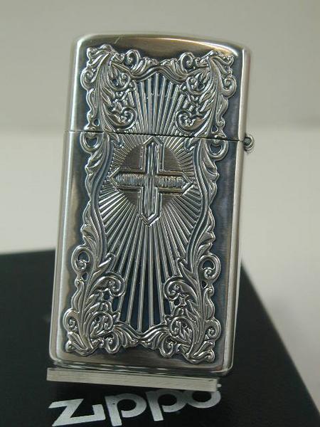 Zippoアラベスク マリア・ディープ彫刻クロス銀燻しスリム両面