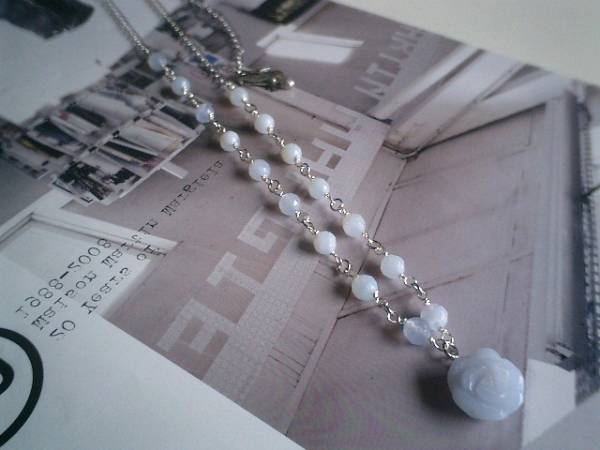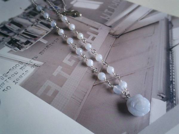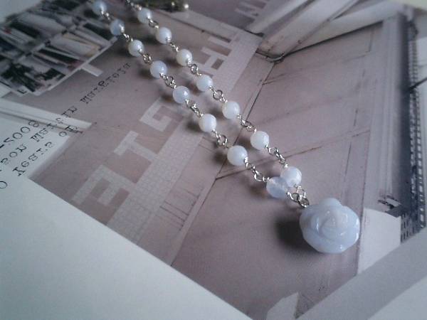 ナチュラル気分・・シリーズです♪儚げな水色の薔薇・・ブルーレースの薔薇のネックレスです♪6ミリのラウンドカットのブルーレースに16ミリ位の薔薇のブルーレースを合わせて可憐な表情です♪長さは全長66センチ位で調節自由です♪チョーカー風にされても素敵です♪♪お揃いのブレスレットも出品しています♪♪シンプルで飽きのこないいつまでも着けられるデザインを考えて作りました!ハンドメイドをご理解頂いてノークレーム、ノーリターンでお願いします